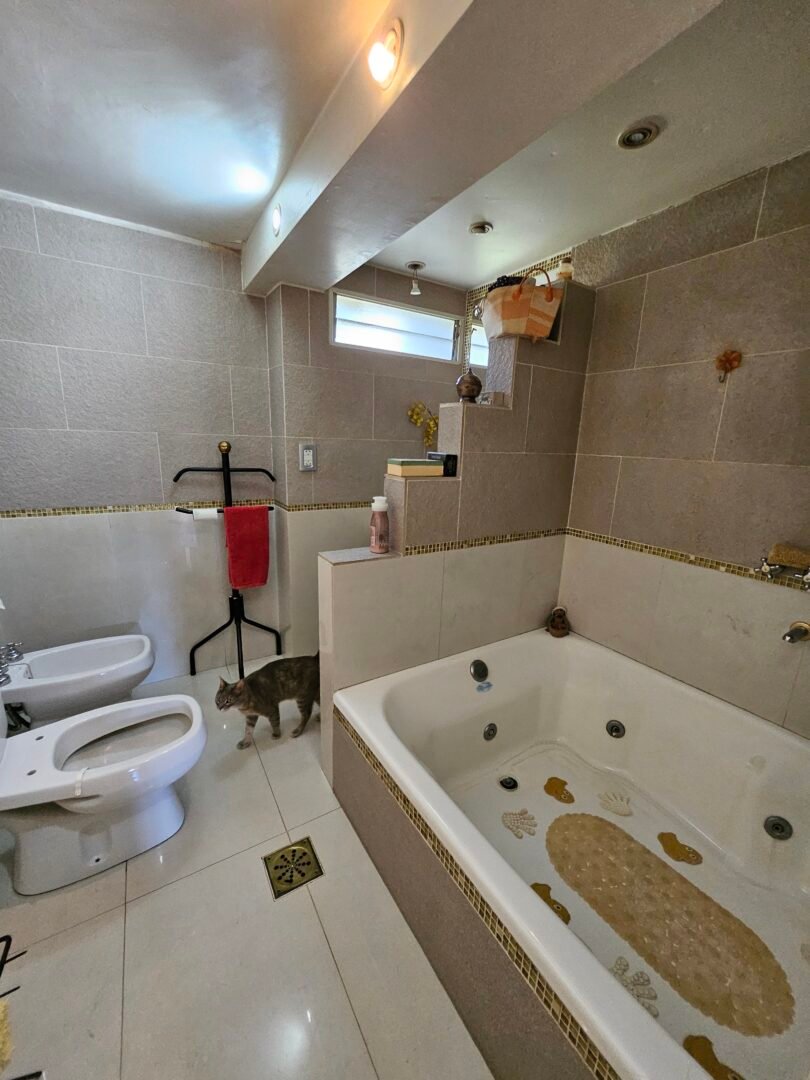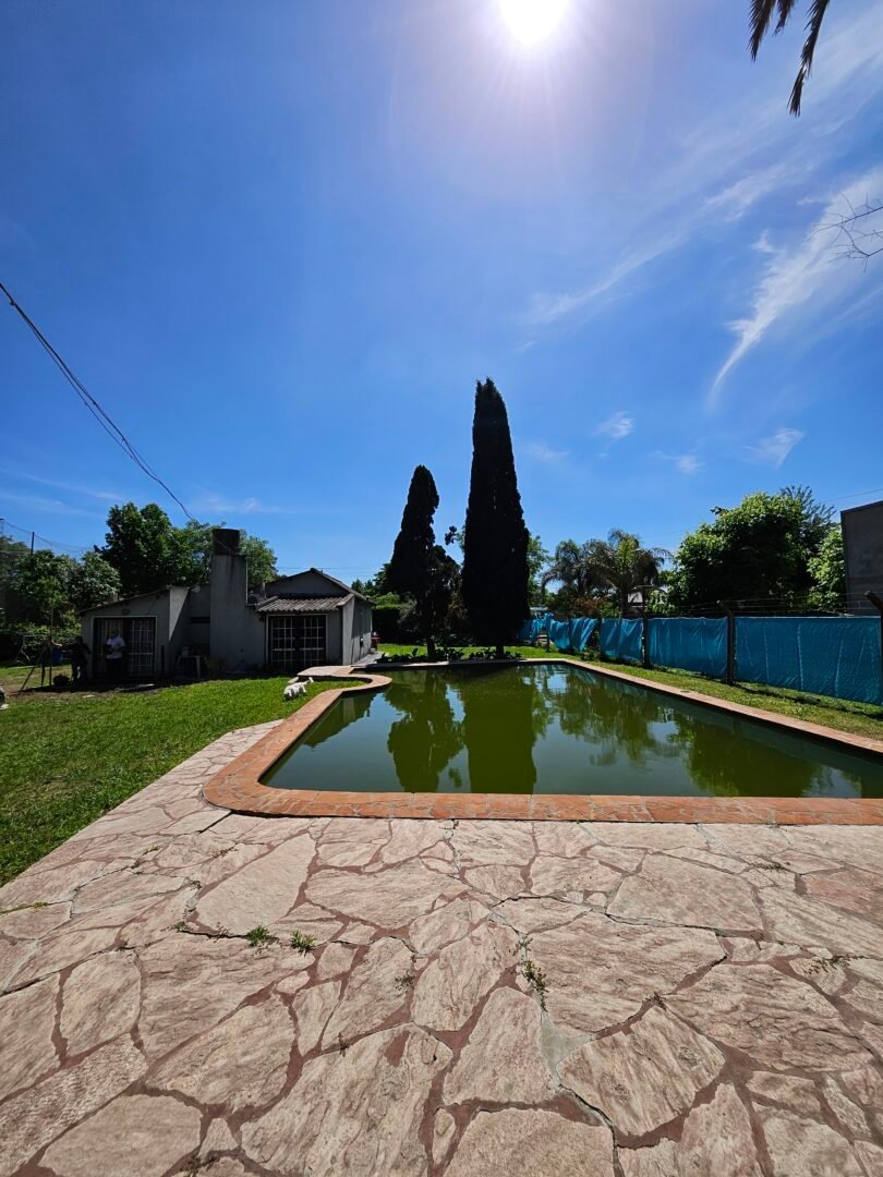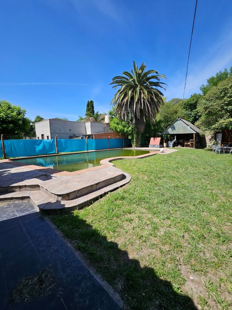 Gran jardin parquizado y arbolado, con pileta de 12 x 7 con filtro. Quincho semicubierto con cocina y dos baños.