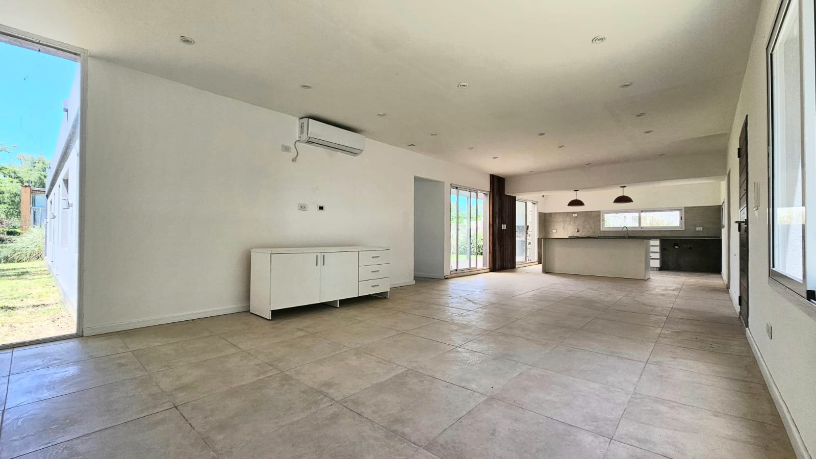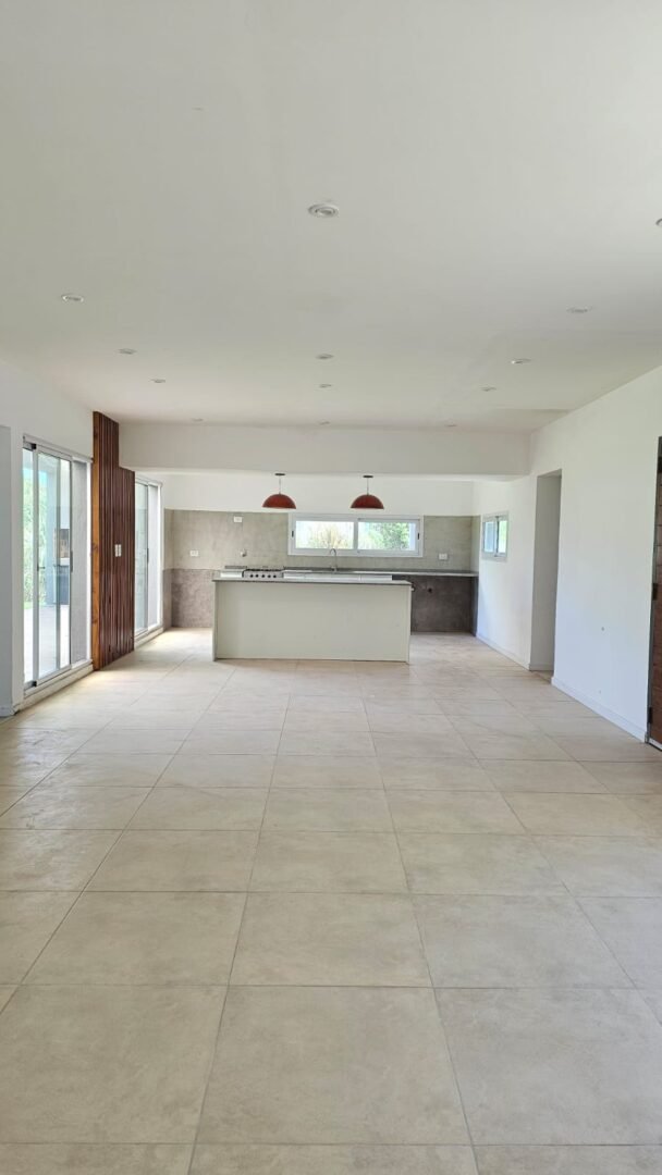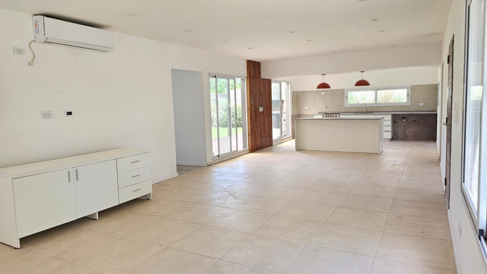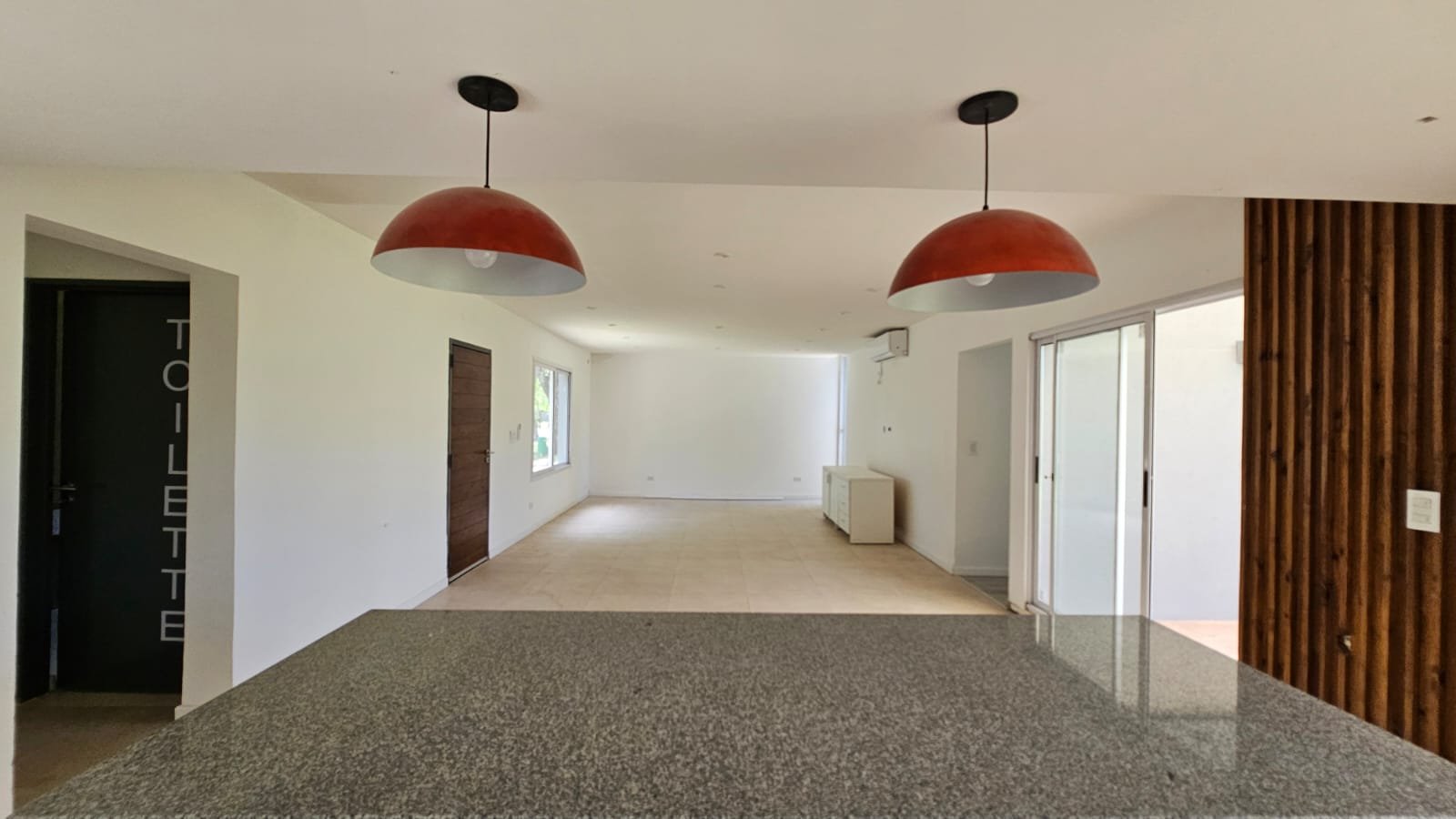Construida en una sola planta, al entrar encontramos un amplio living comedor con cocina integrada con isla y pisos de porcelanato. Toilette de recepción amplio.