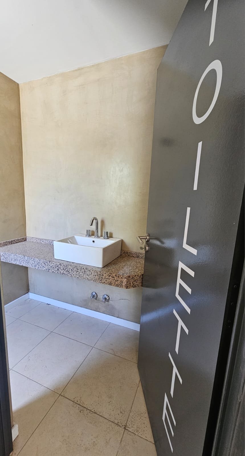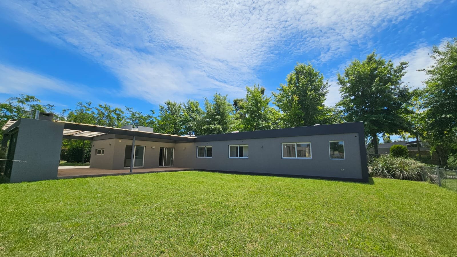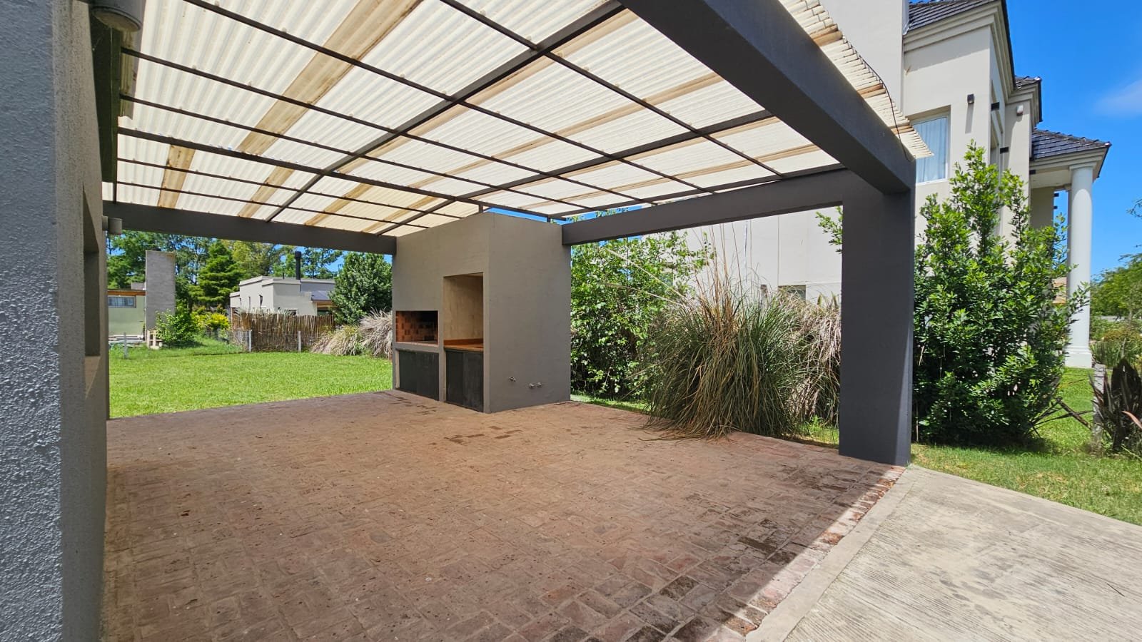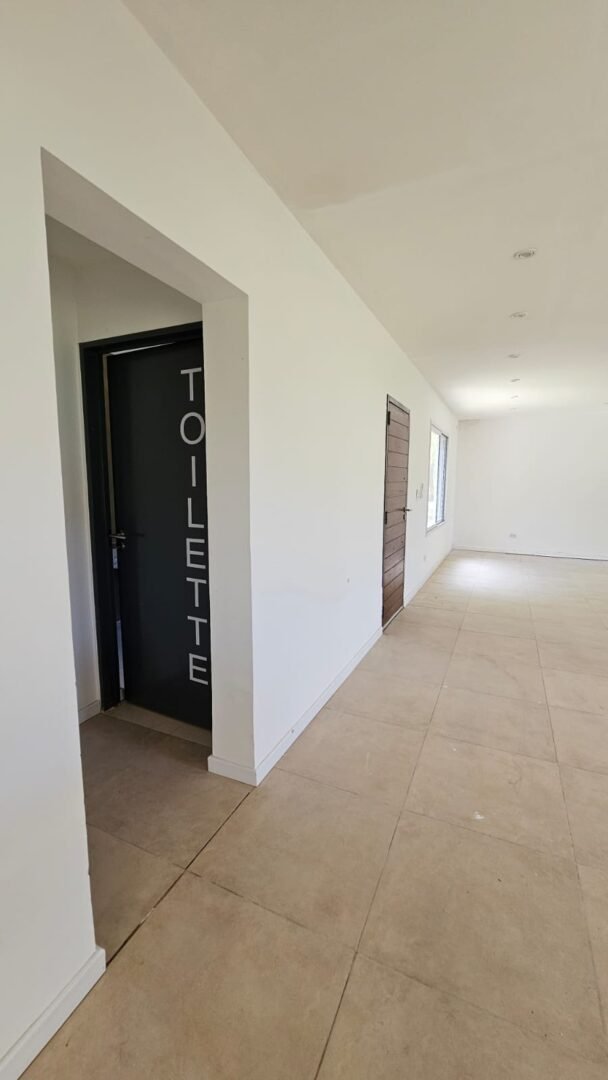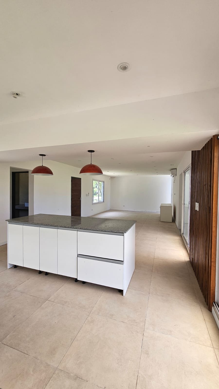 Construida en una sola planta, al entrar encontramos un amplio living comedor con cocina integrada con isla y pisos de porcelanato. Toilette de recepción amplio.