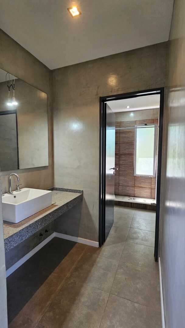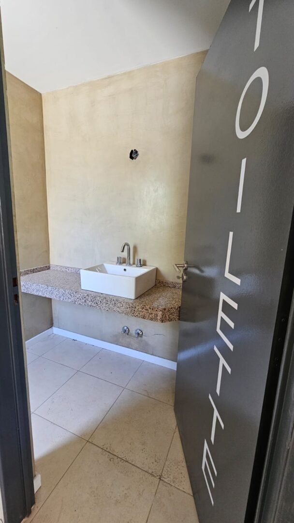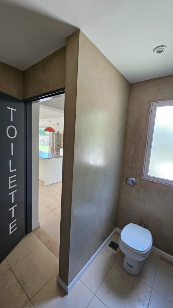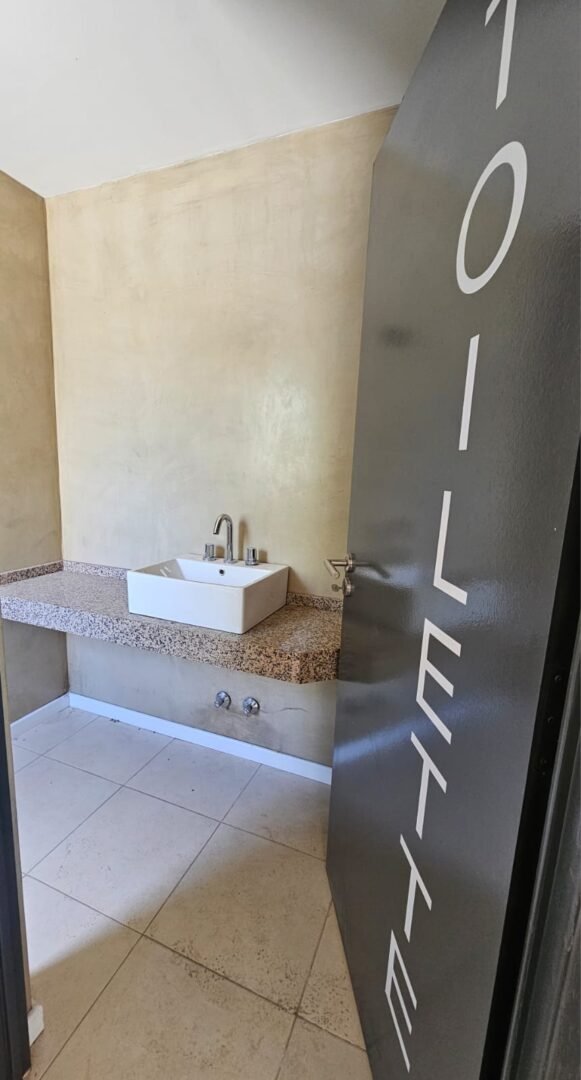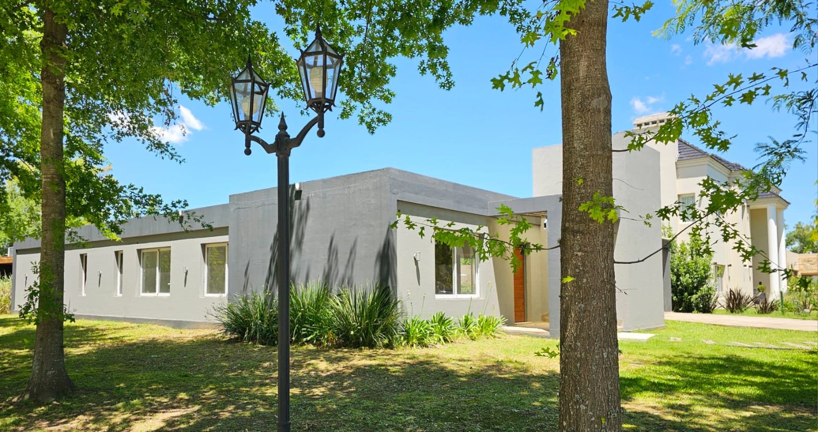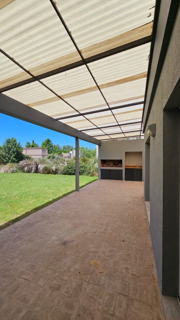 Construida en una sola planta, al entrar encontramos un amplio living comedor con cocina integrada con isla y pisos de porcelanato. Toilette de recepción amplio.
