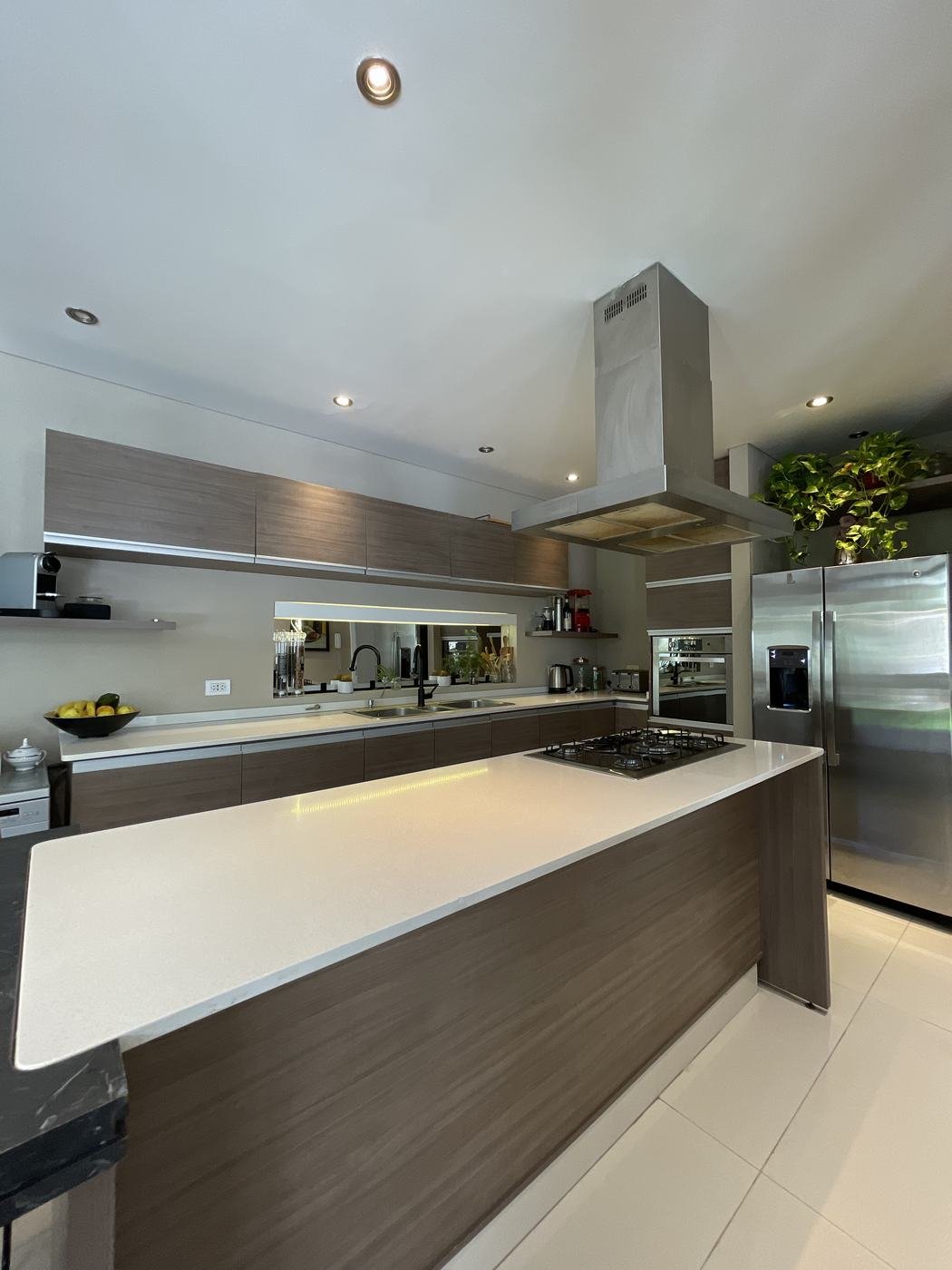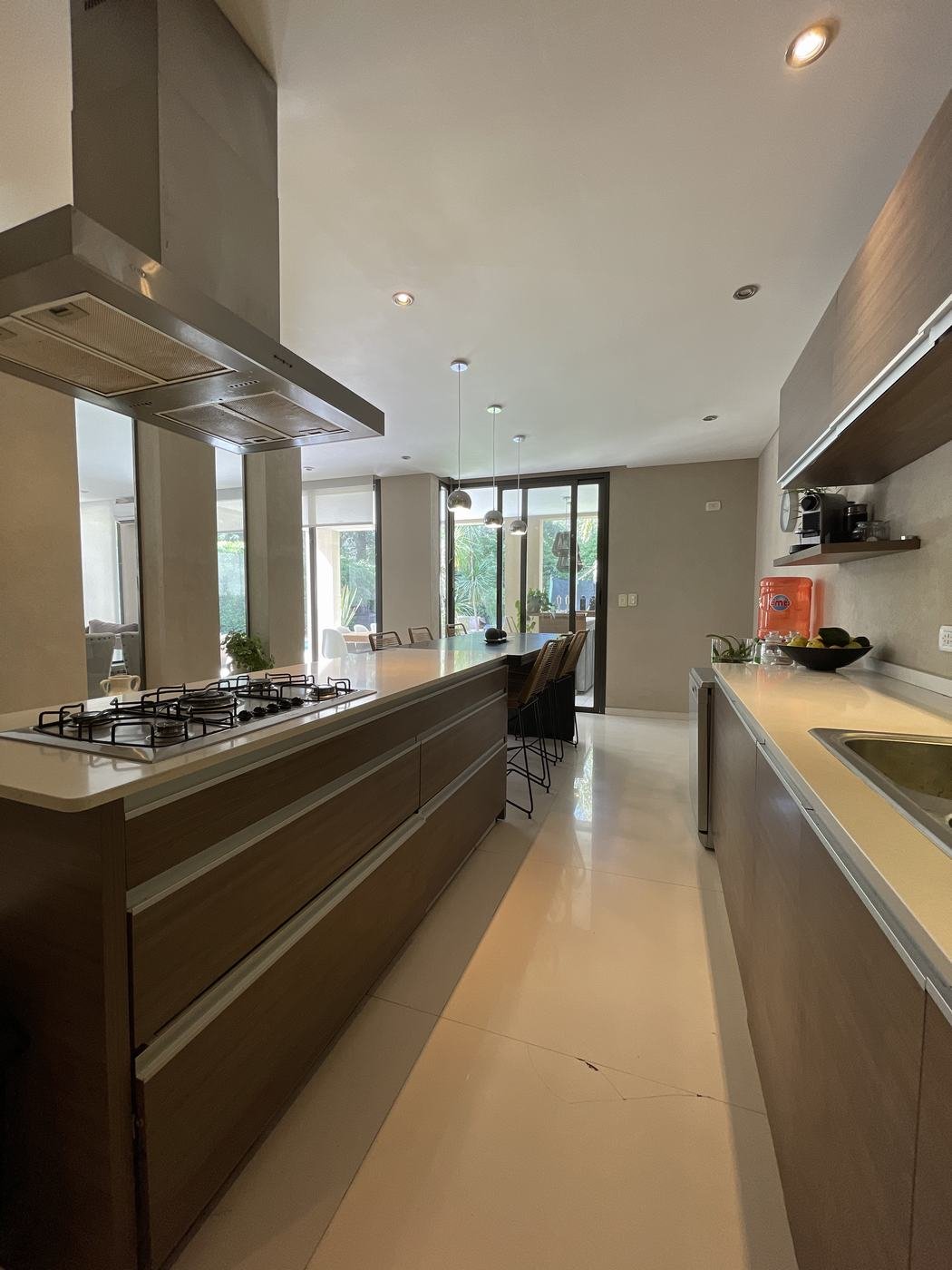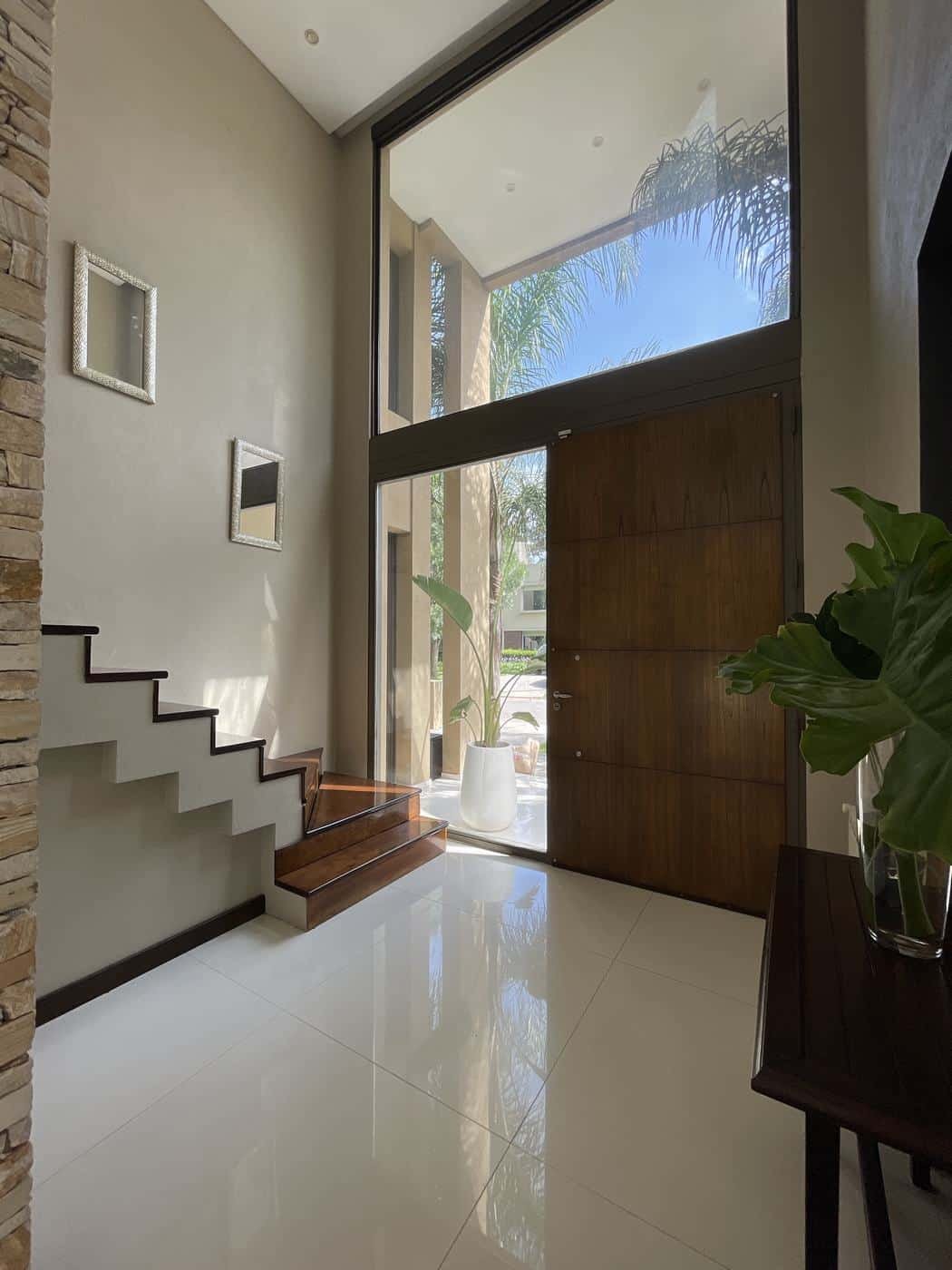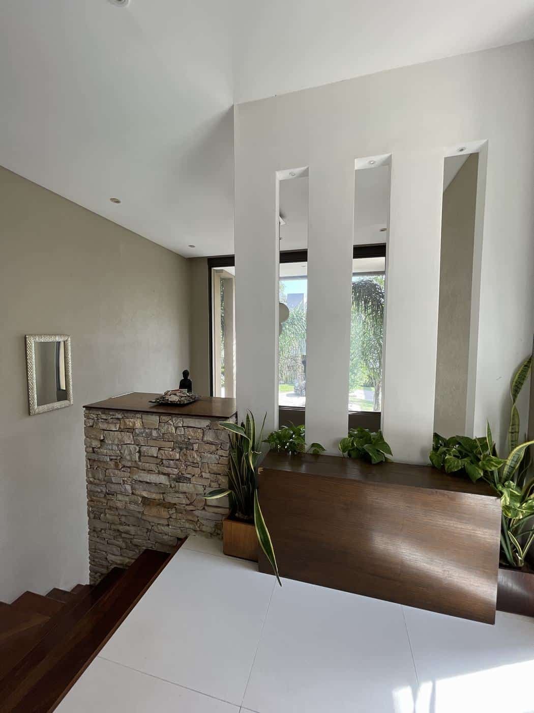 PB: Hall de recepción con doble altura, living comedor con hogar, cocina comedor con isla, totalmente equipada con mesada de Silestone. Escritorio y toilette de recepción.