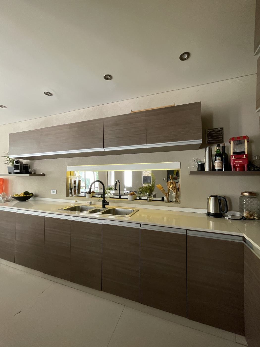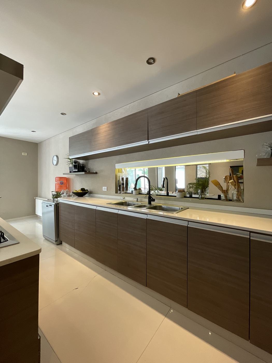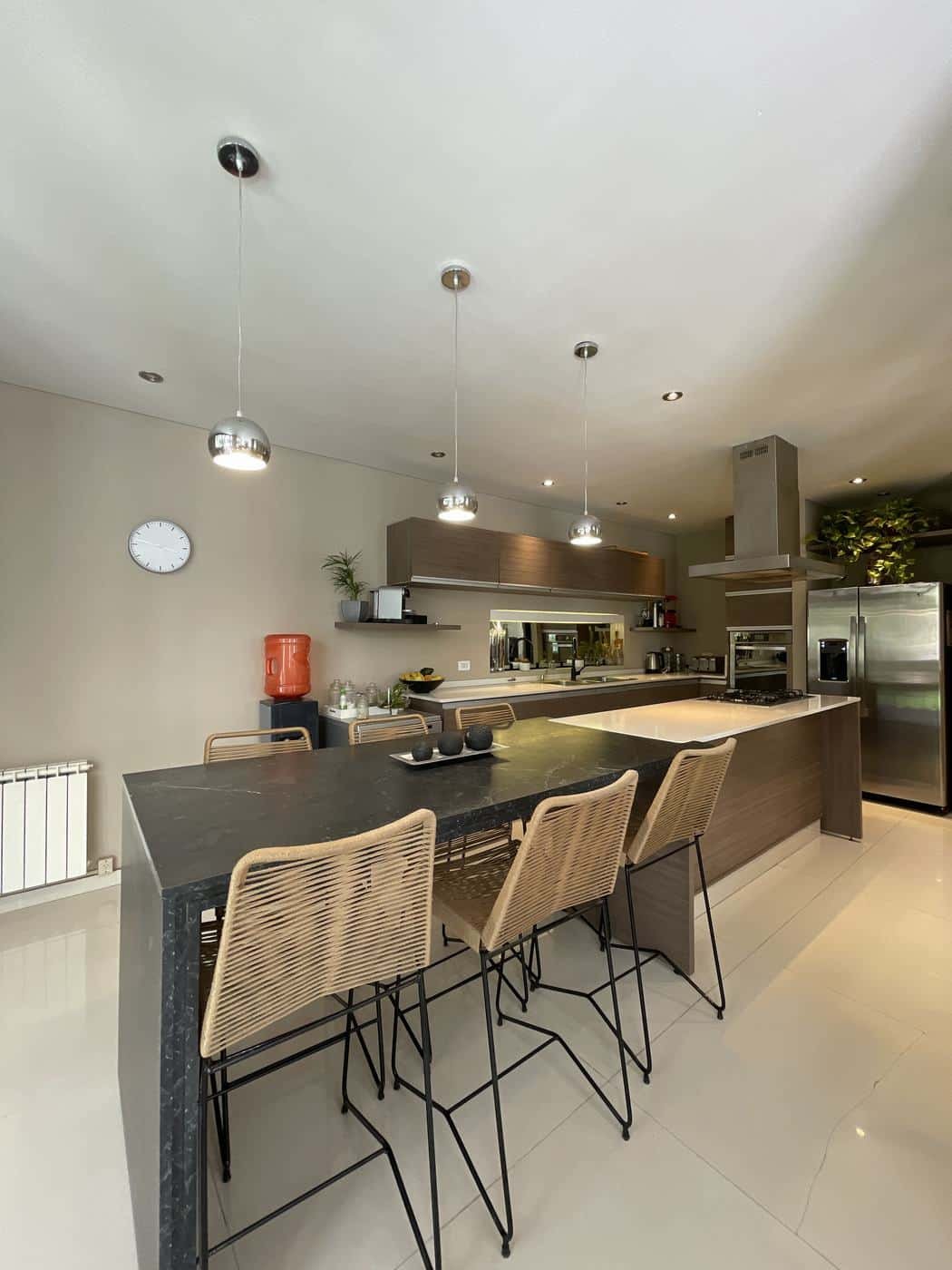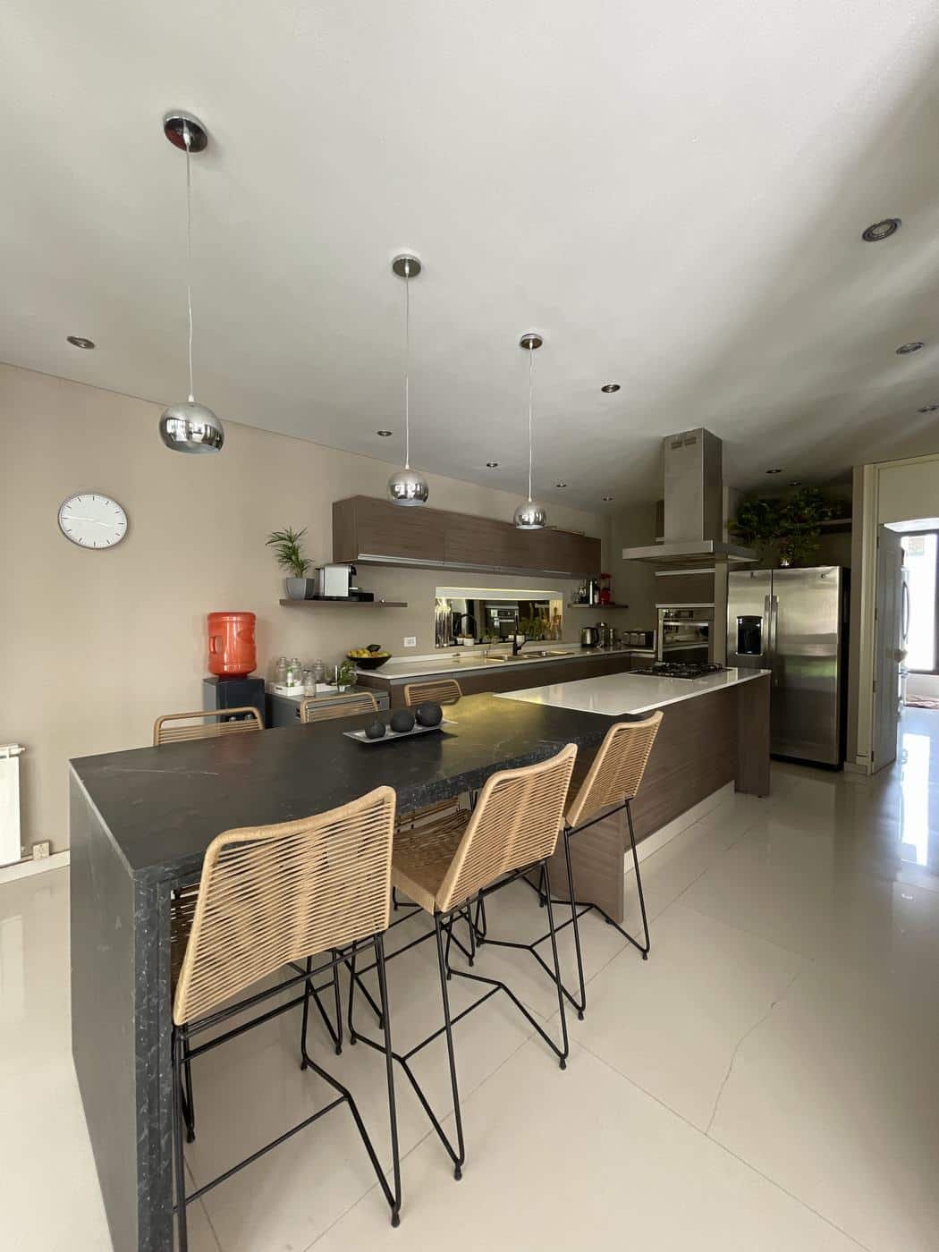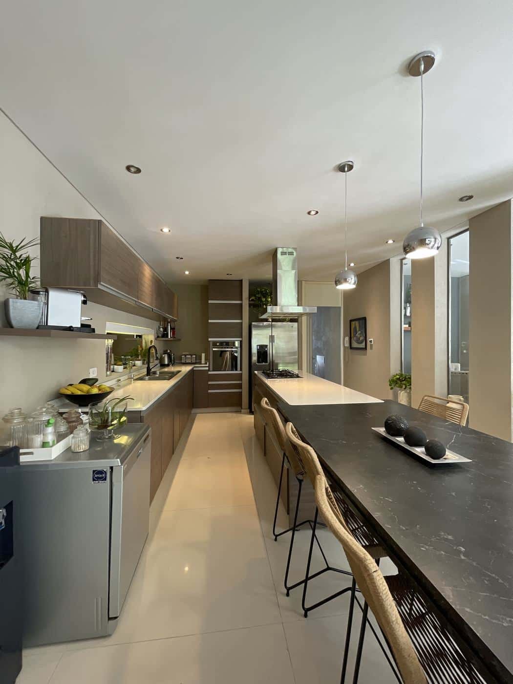 PB: Hall de recepción con doble altura, living comedor con hogar, cocina comedor con isla, totalmente equipada con mesada de Silestone. Escritorio y toilette de recepción.