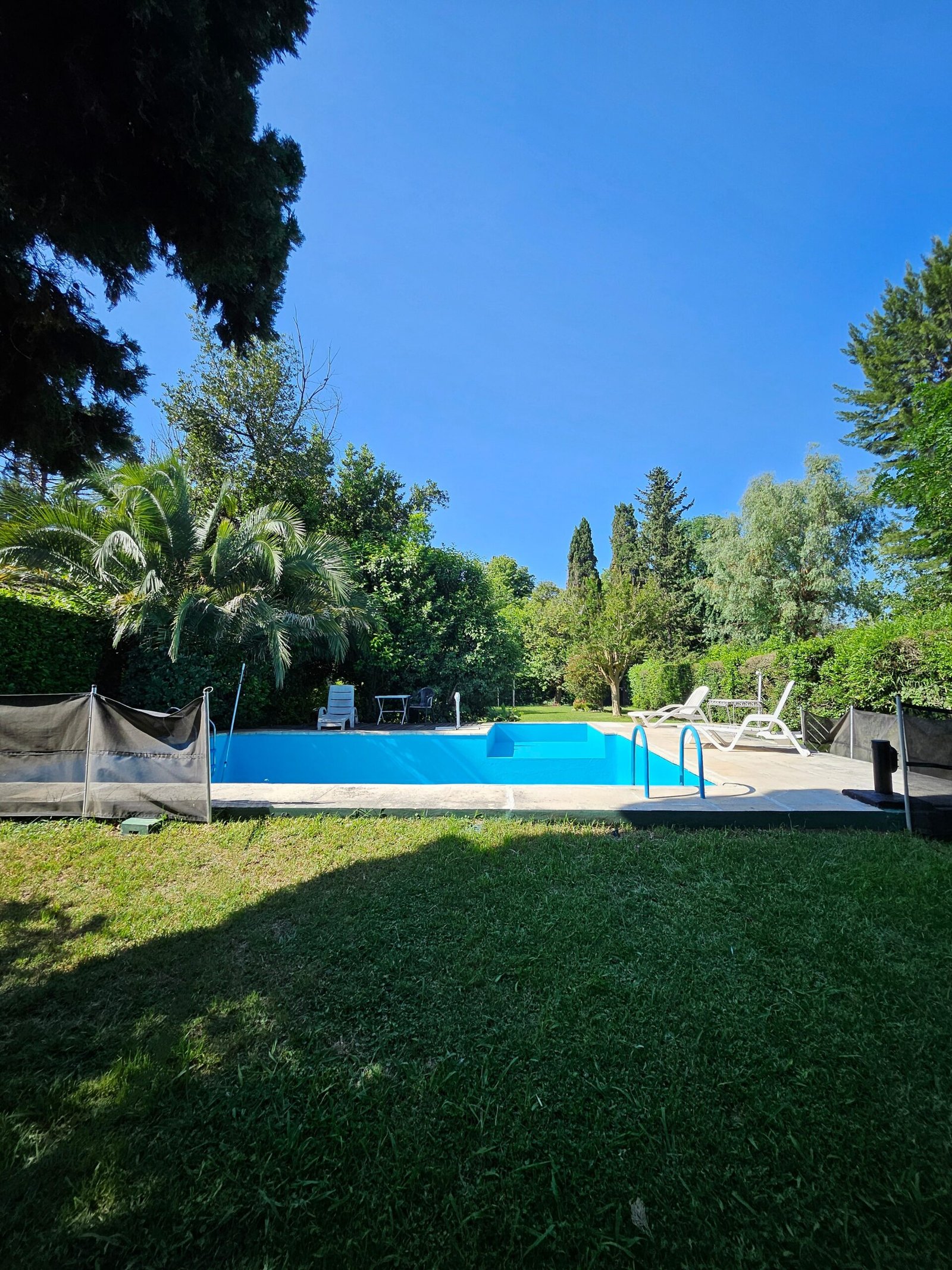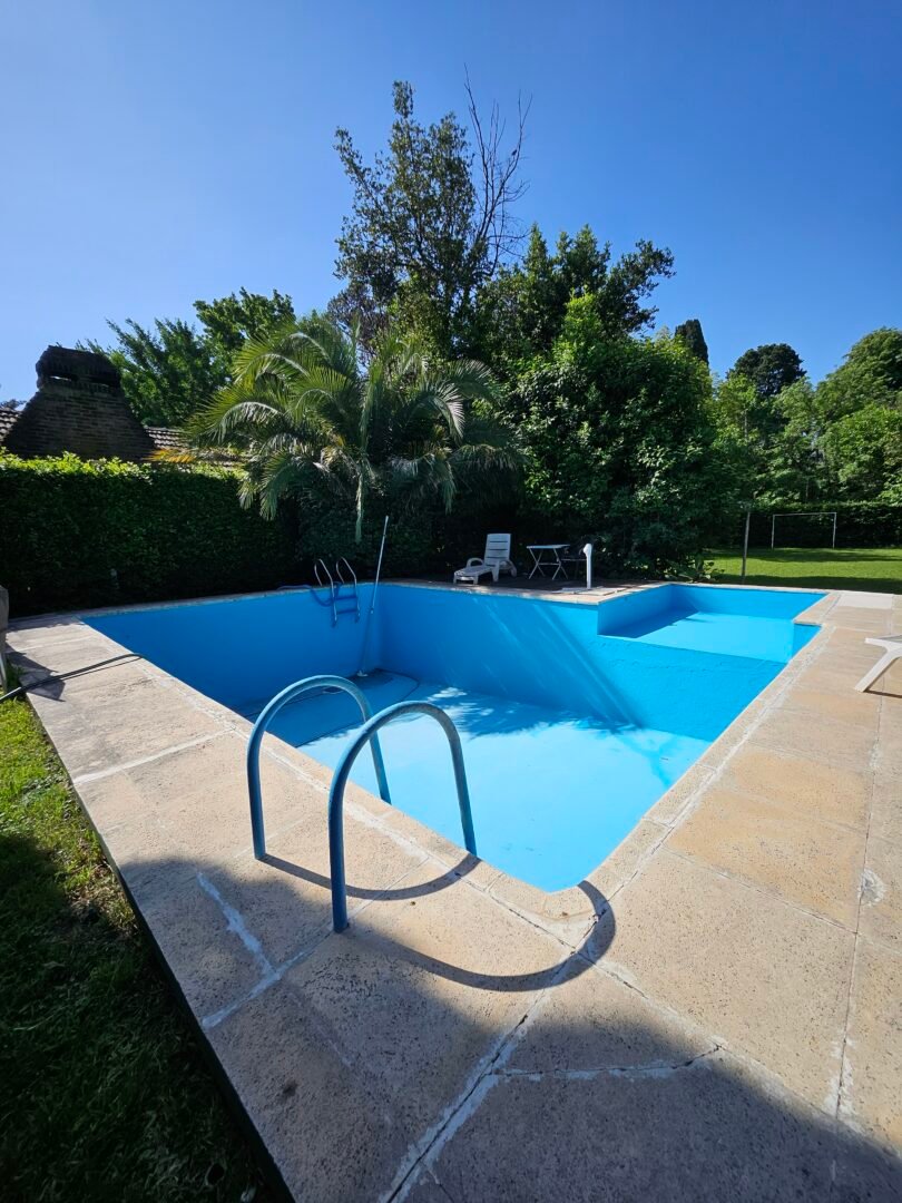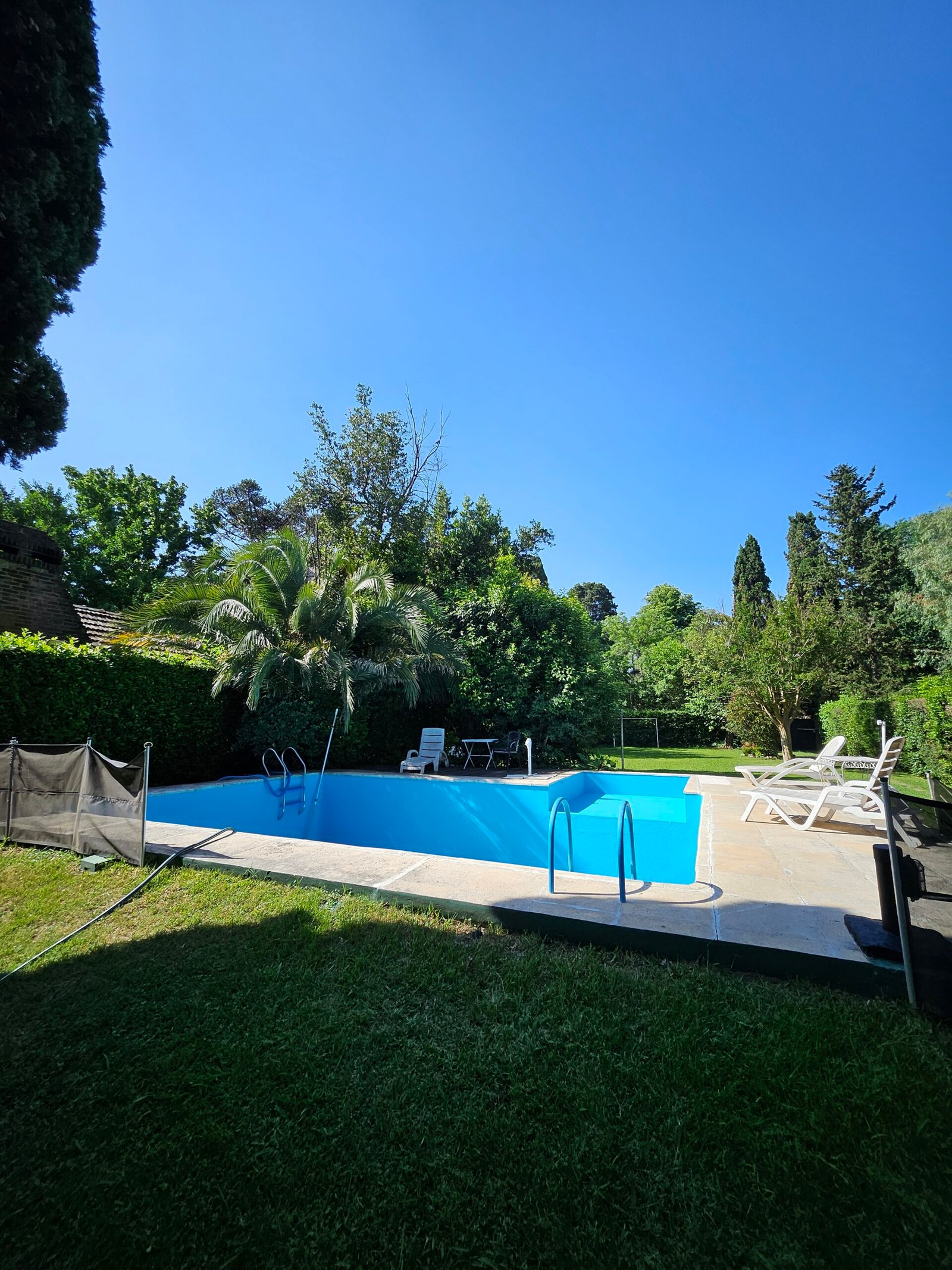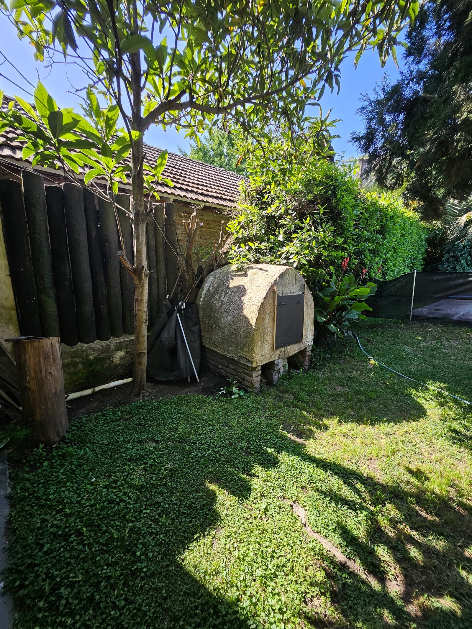 Hermoso jardín amplio con mucha arboleda, pileta con solarium, quincho semicubierto con parrilla. Horno de barro