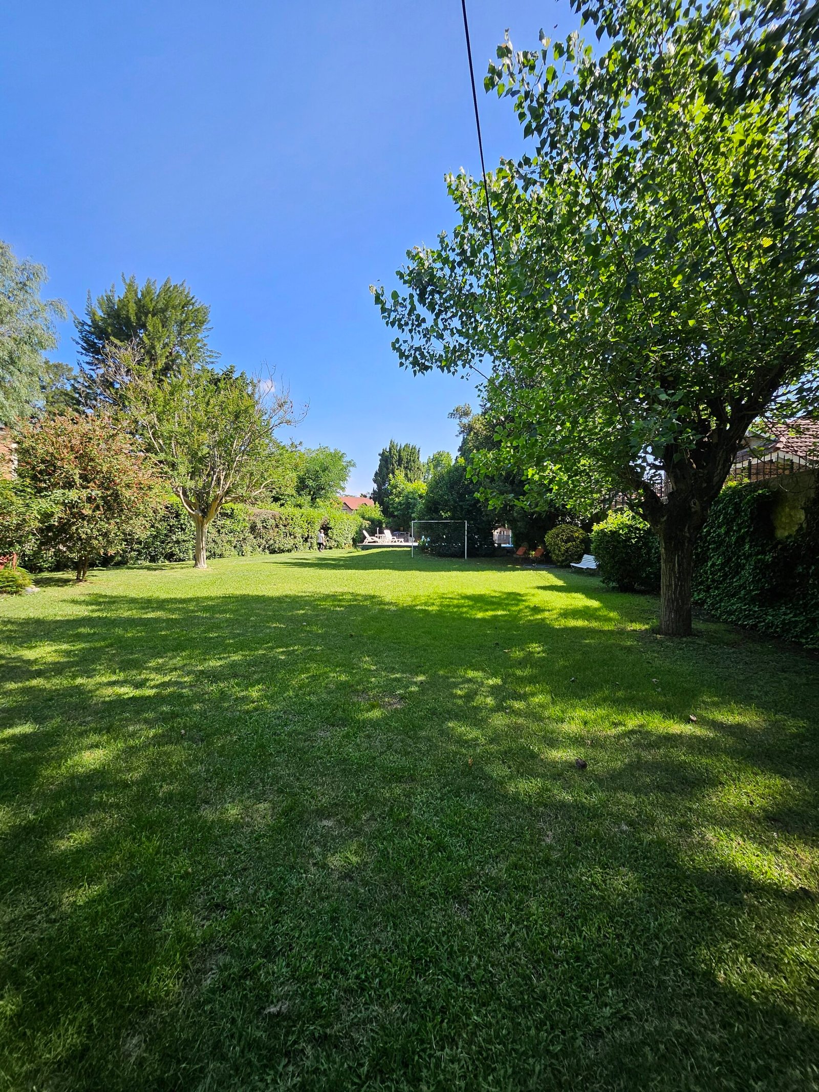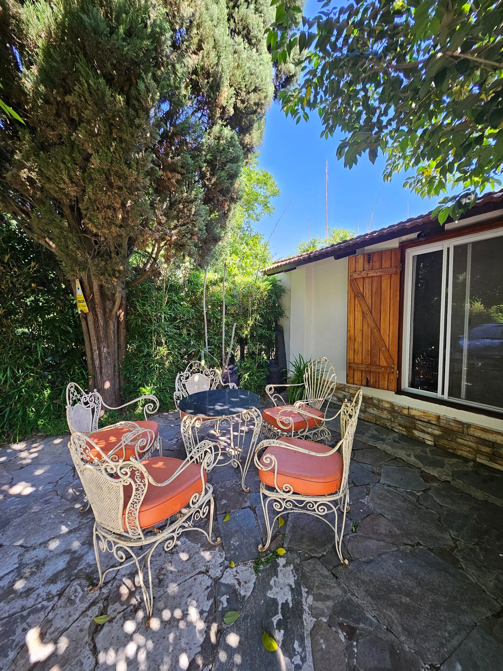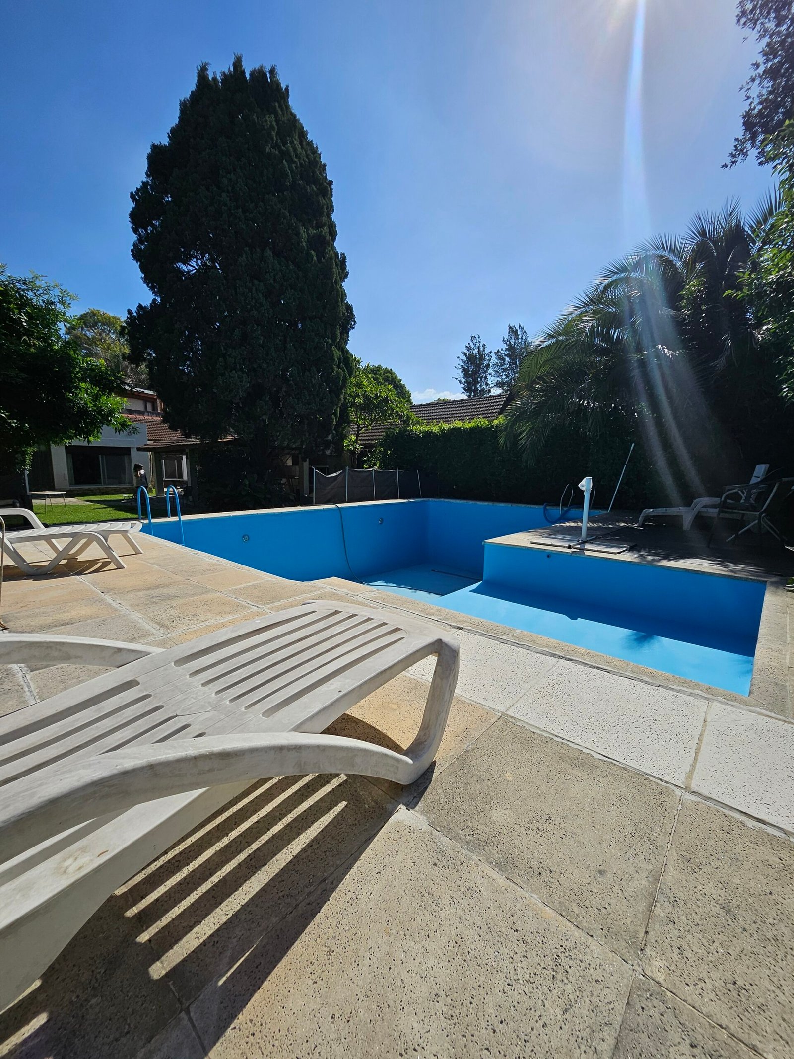 Hermoso jardín amplio con mucha arboleda, pileta con solarium, quincho semicubierto con parrilla. Horno de barro