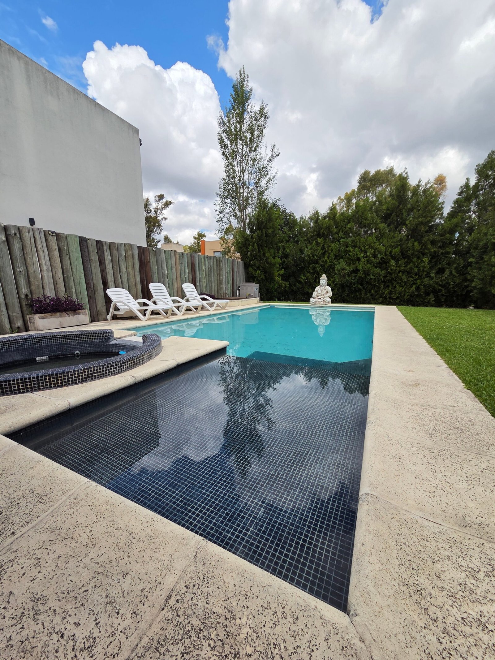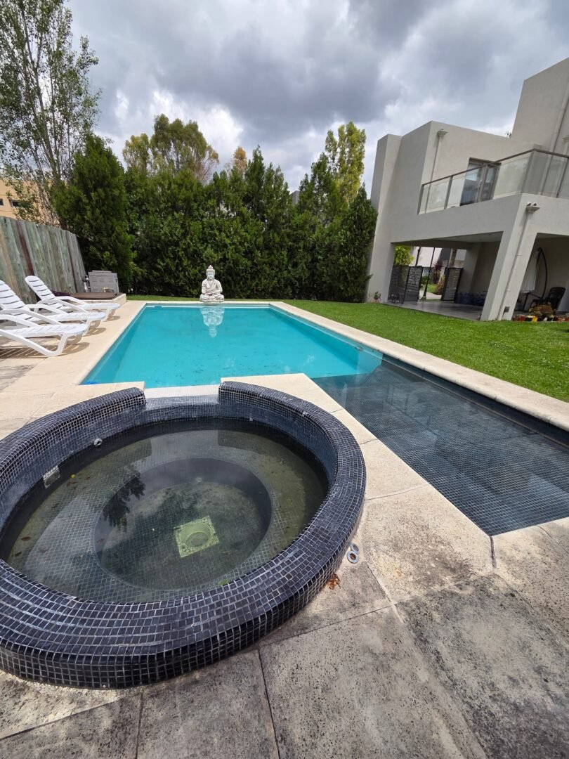 Piscina climatizada con jacuzzi y playón húmedo, sistema de riego automático