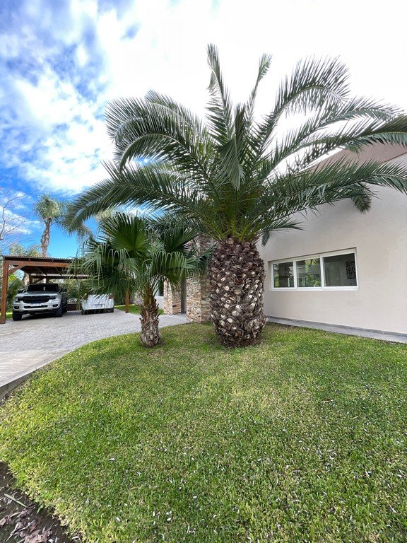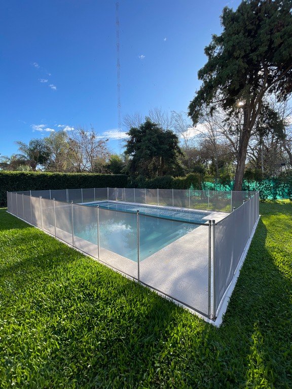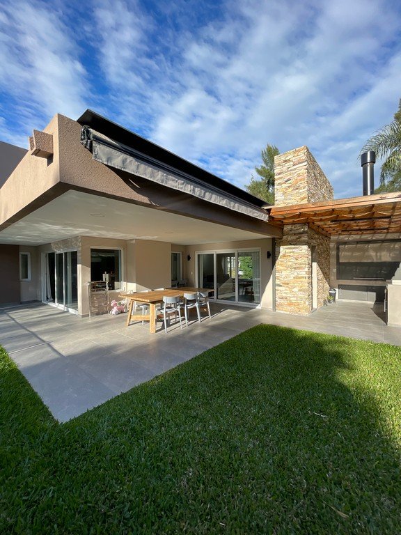 Jardín parquizado, pileta de 9×5 climatizada, revestida con venecitas y playa húmeda. Galería en L semi cubierta con parrilla, mesada con bacha, toldos. Cuarto guarda útiles.