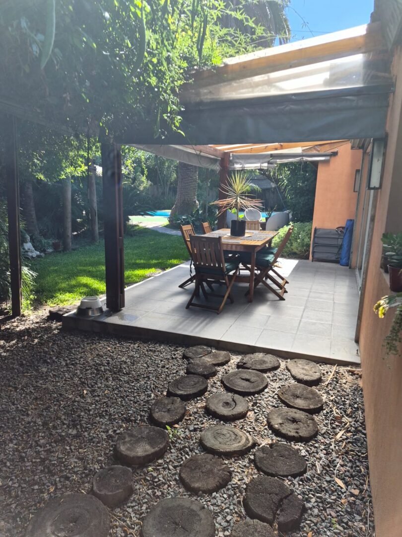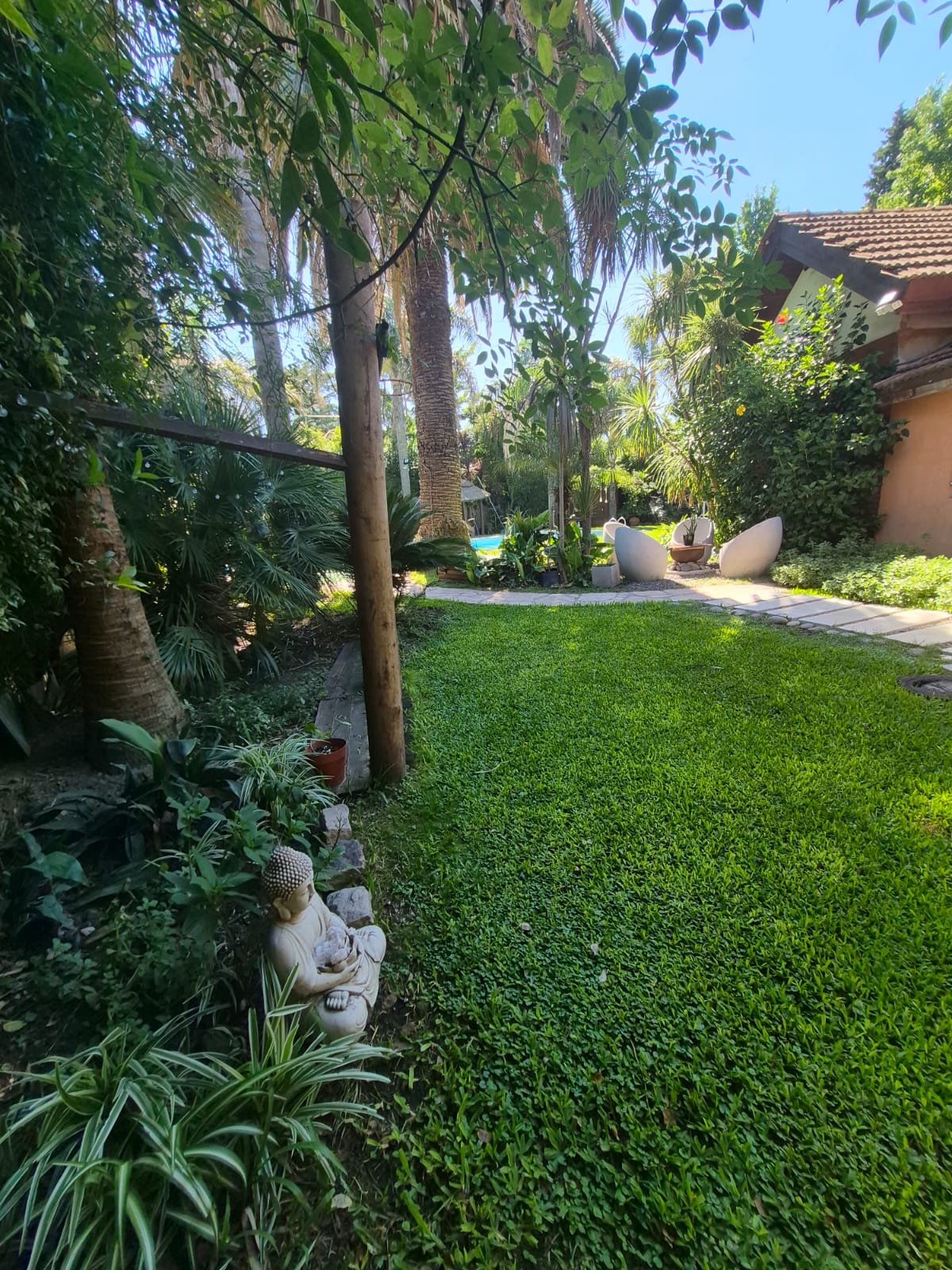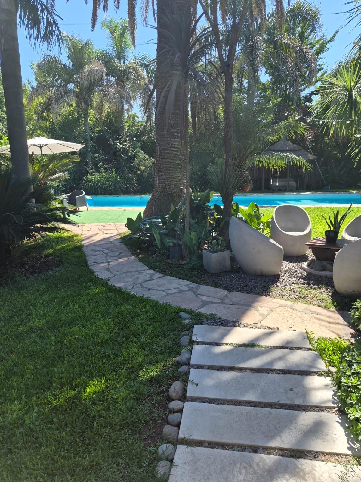 Jardín parquizado, grna variedad de arboles y palmeras, con pileta de 15 x 5 con sistema de filtro nuevo , riego por aspersión. Galería con cerramiento de toldos.