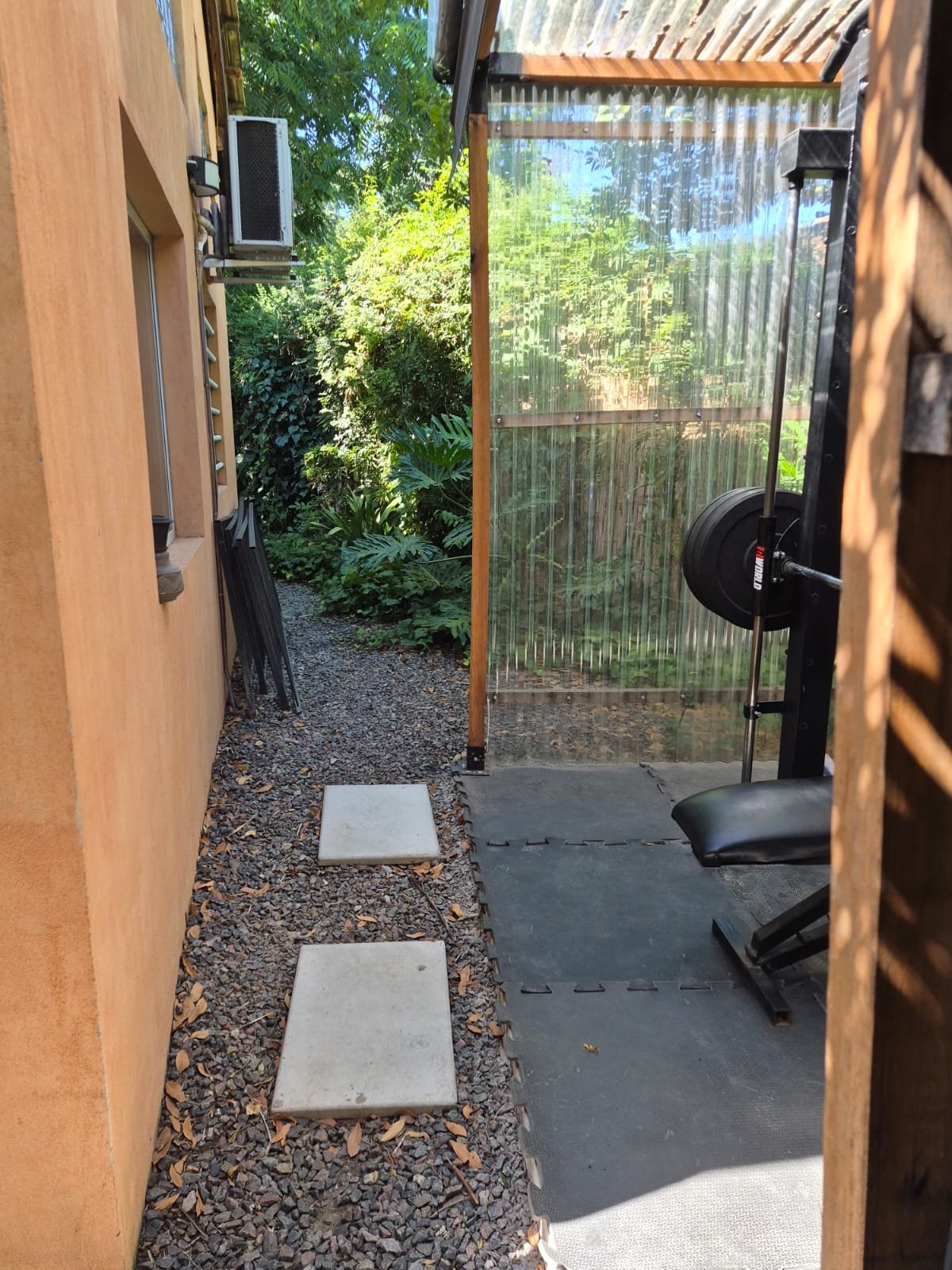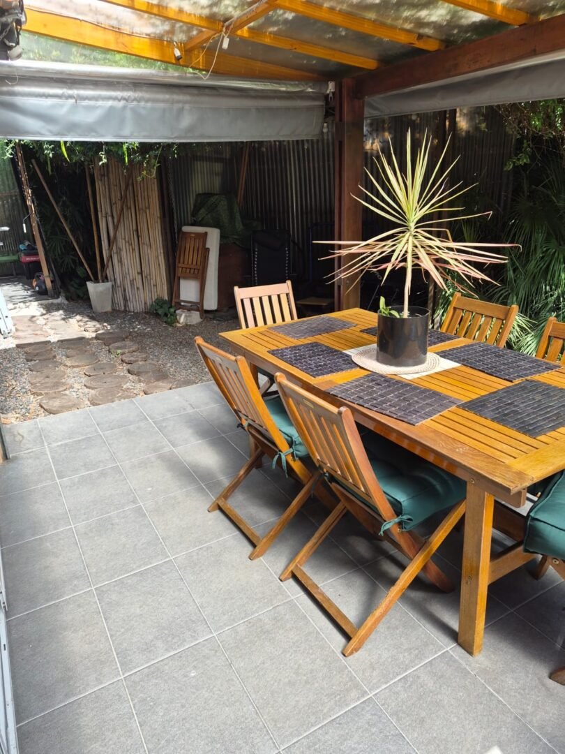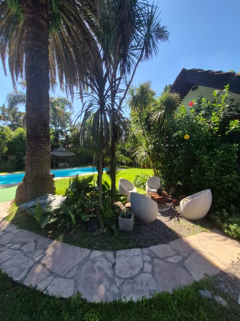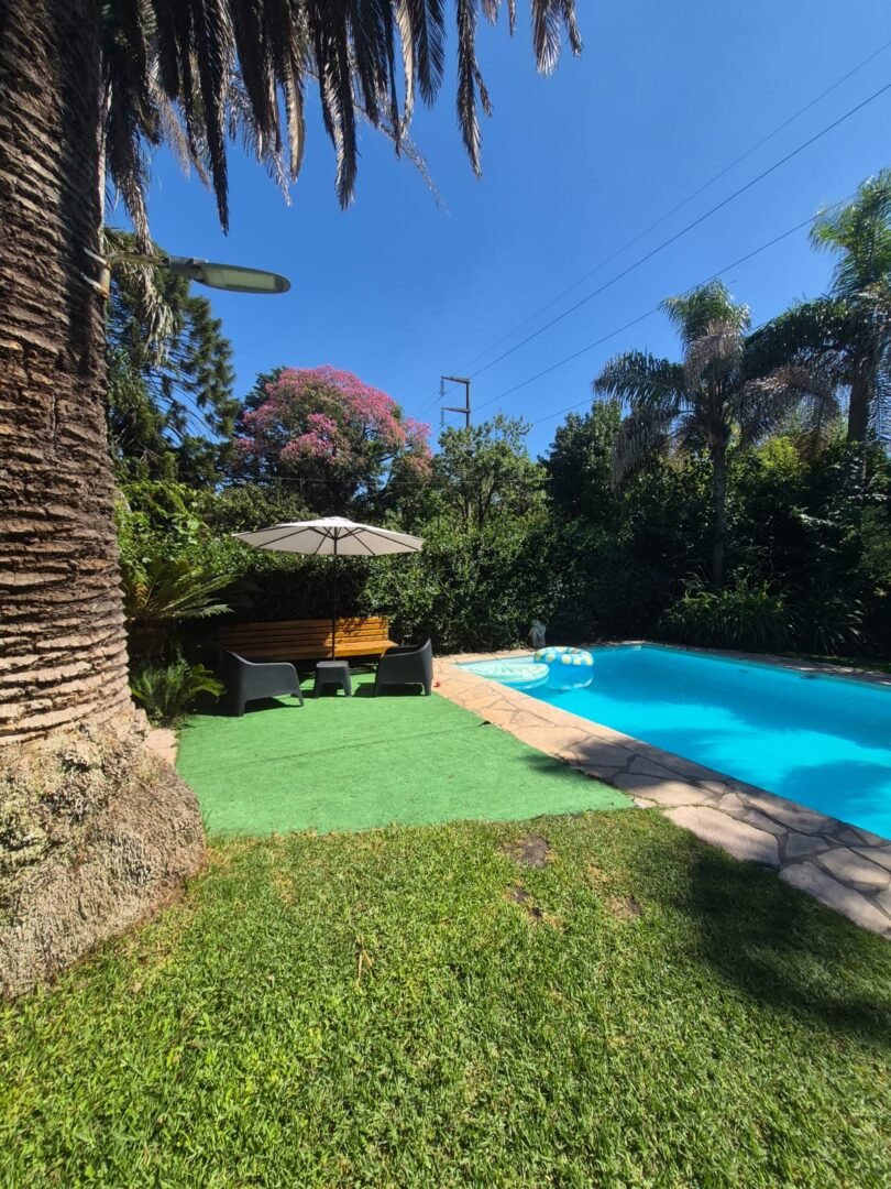 Jardín parquizado, grna variedad de arboles y palmeras, con pileta de 15 x 5 con sistema de filtro nuevo , riego por aspersión. Galería con cerramiento de toldos.