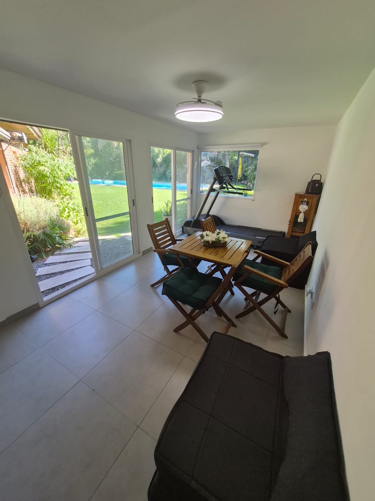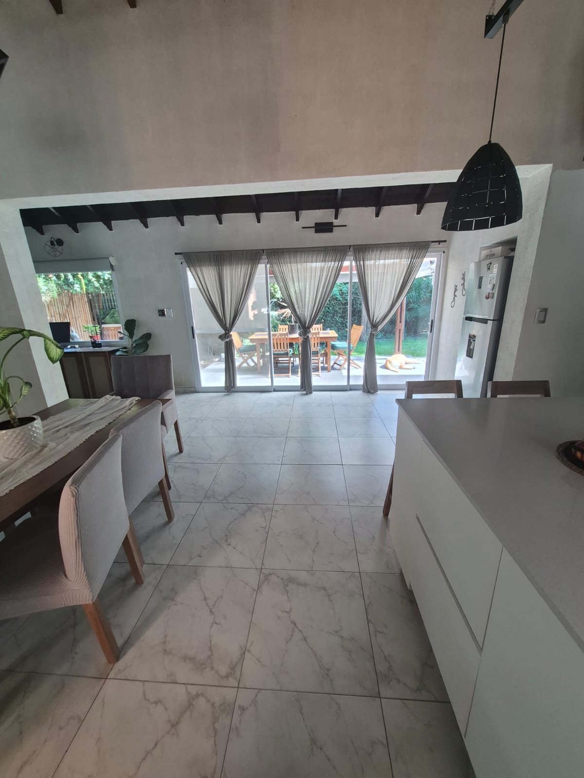 Gran ambiente integrado de living cocina comedor con vistas al jardín y leños a gas. Toilette de recepción.