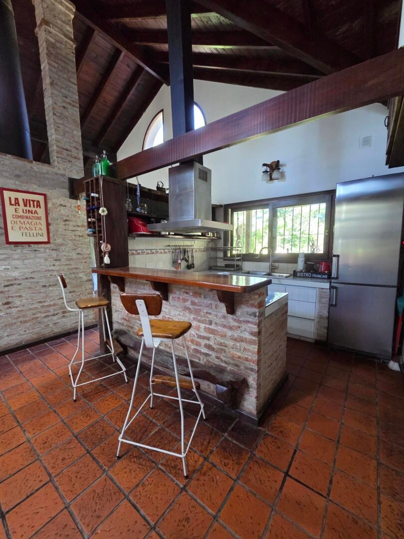 Distribución circular, living con hogar y doble altura, comedor, cocina totalmente equipada con barra desayunadora