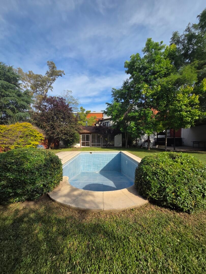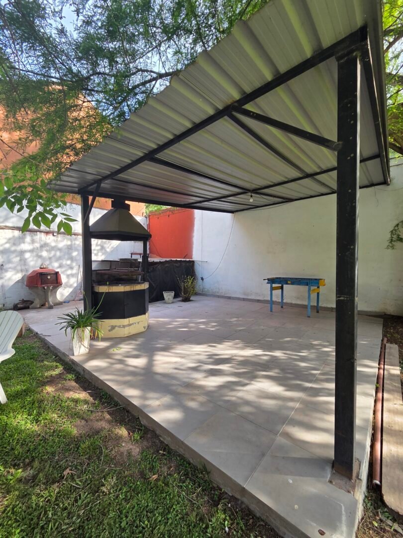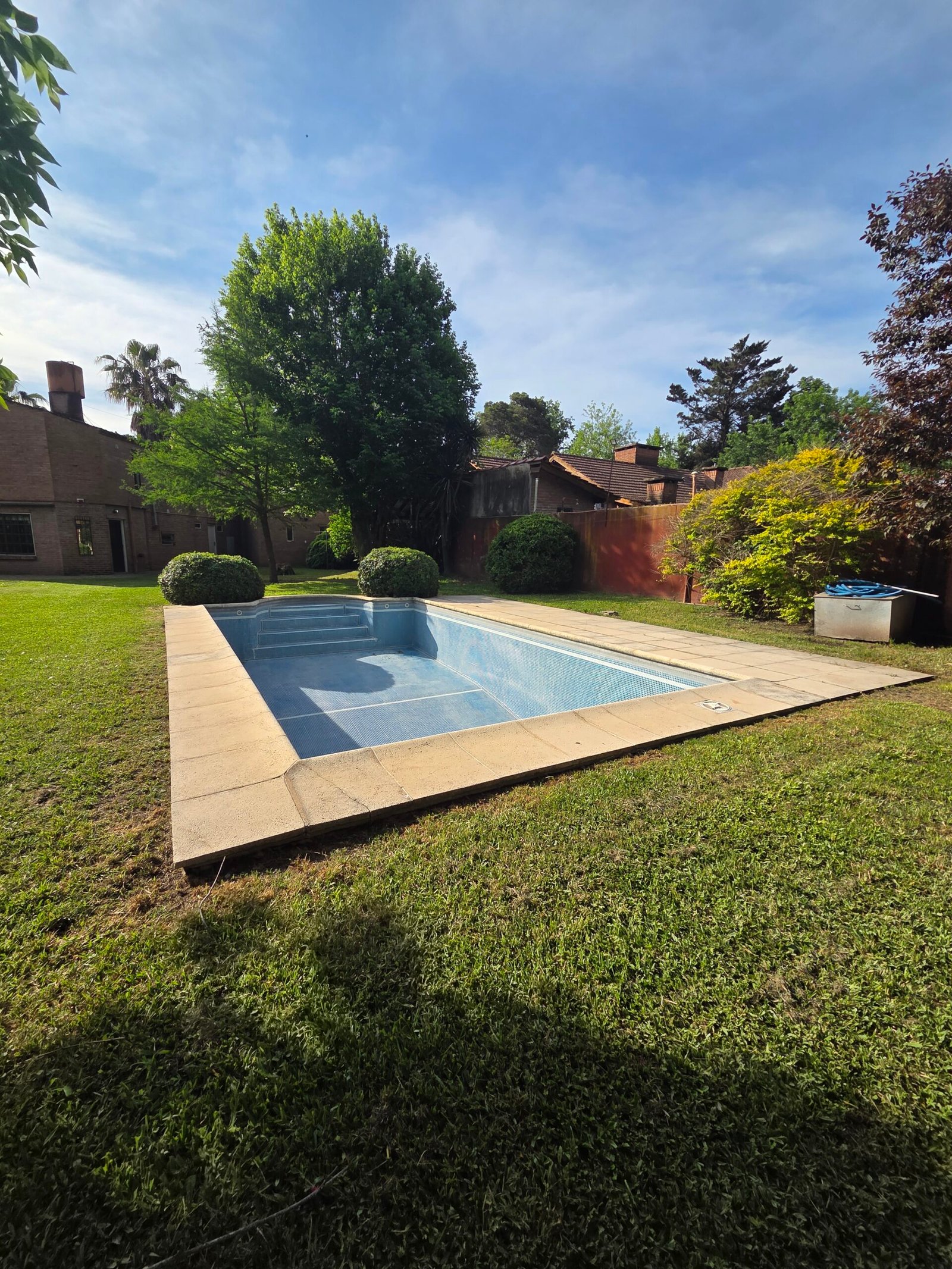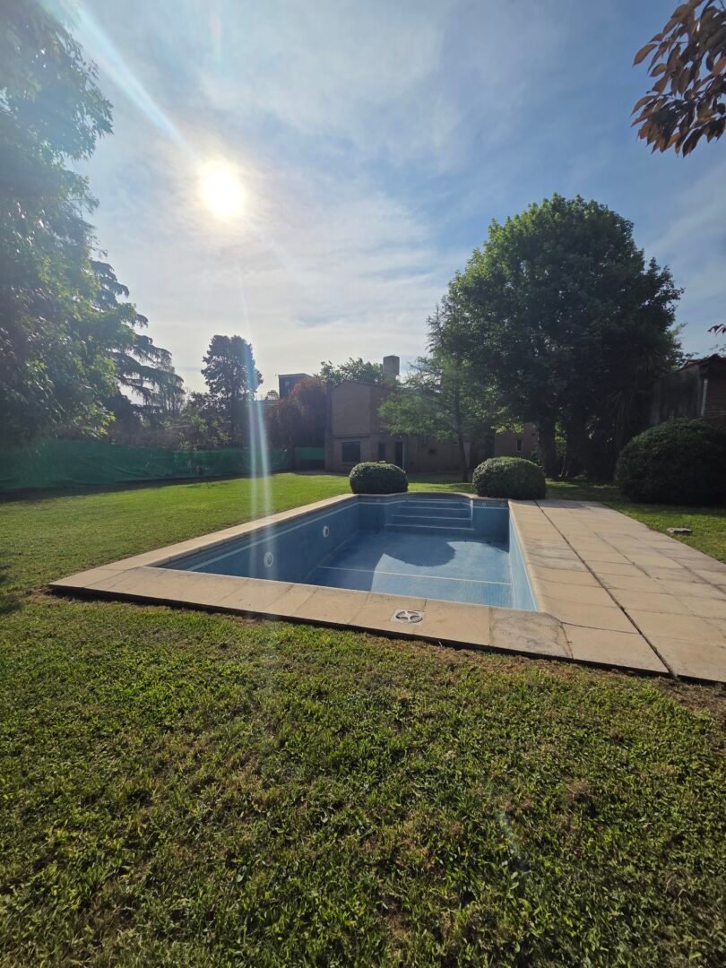 Quincho cubierto con parrilla, baño y cocina, pileta de 8 x 4 revestida con venecitas, guarda útiles.