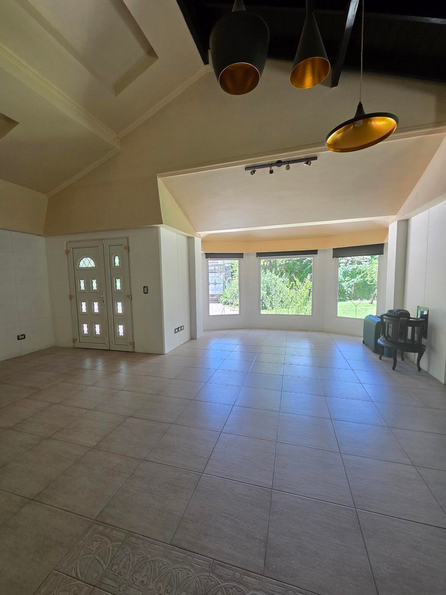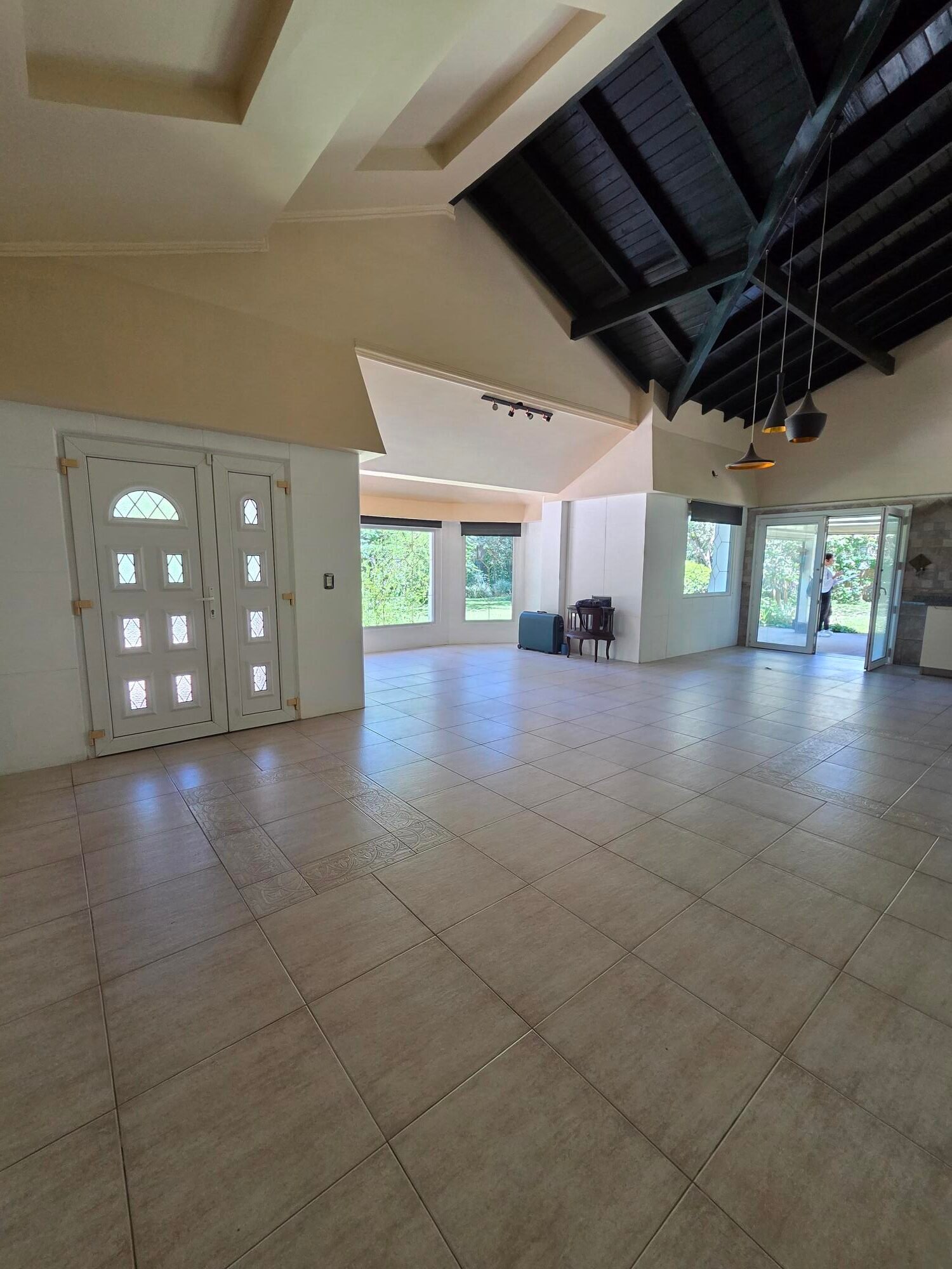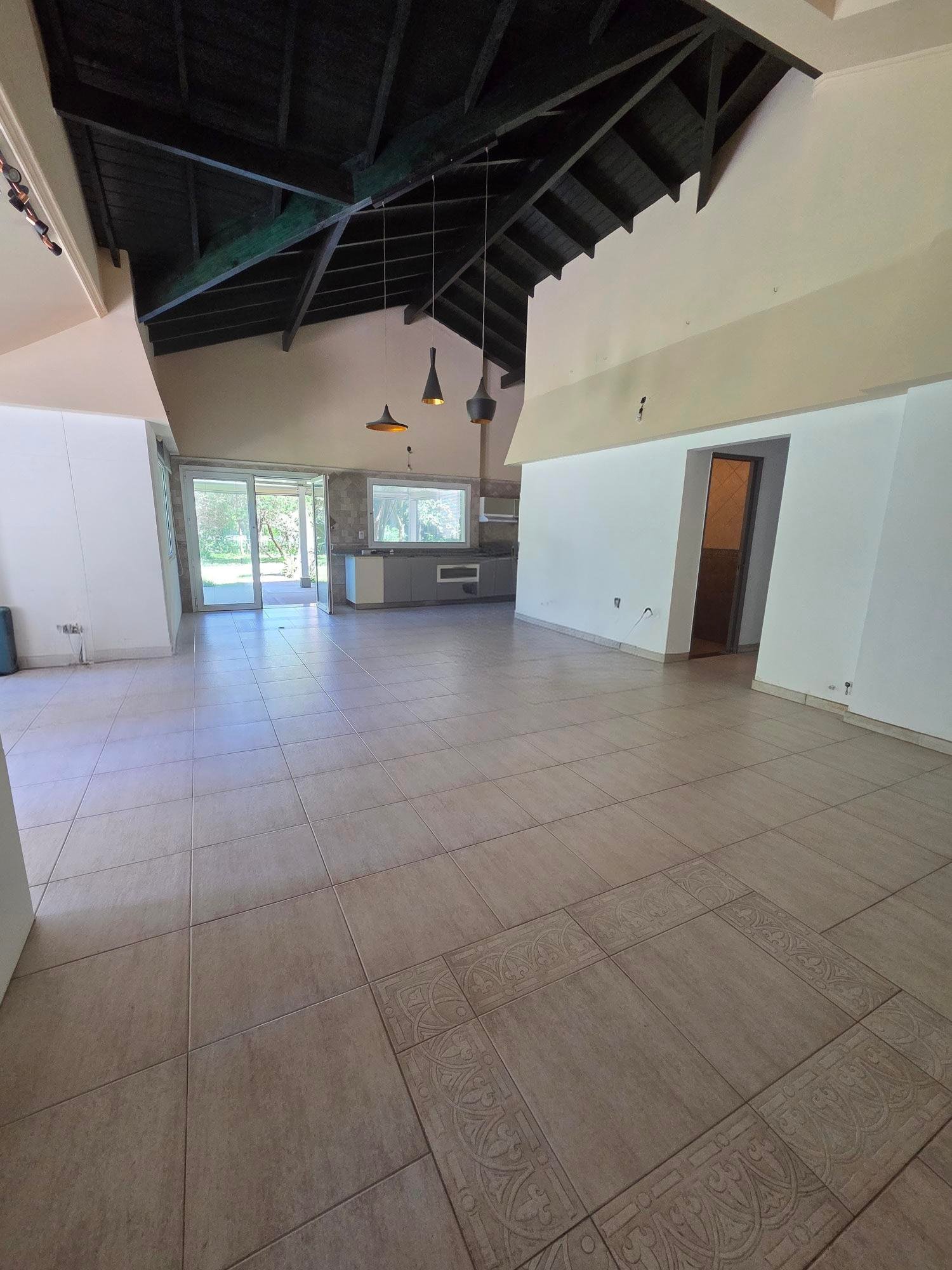 Amplio living comedor con cocina integrada con muebles marca Johnson , todo con ventanales al jardín.