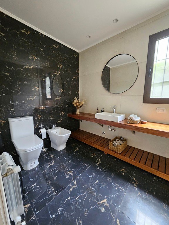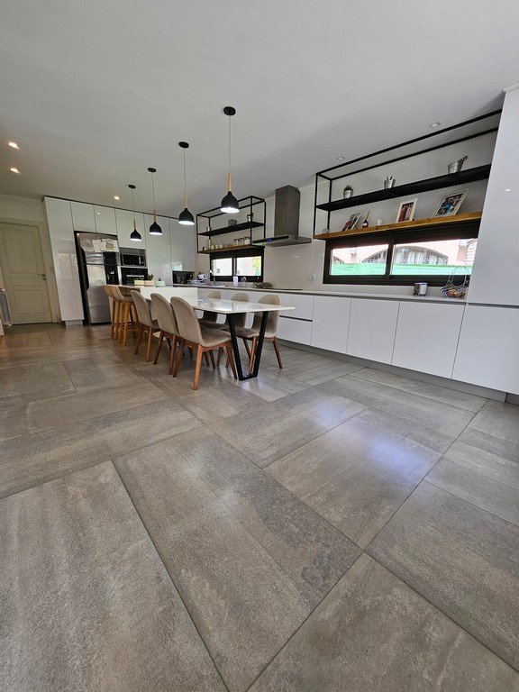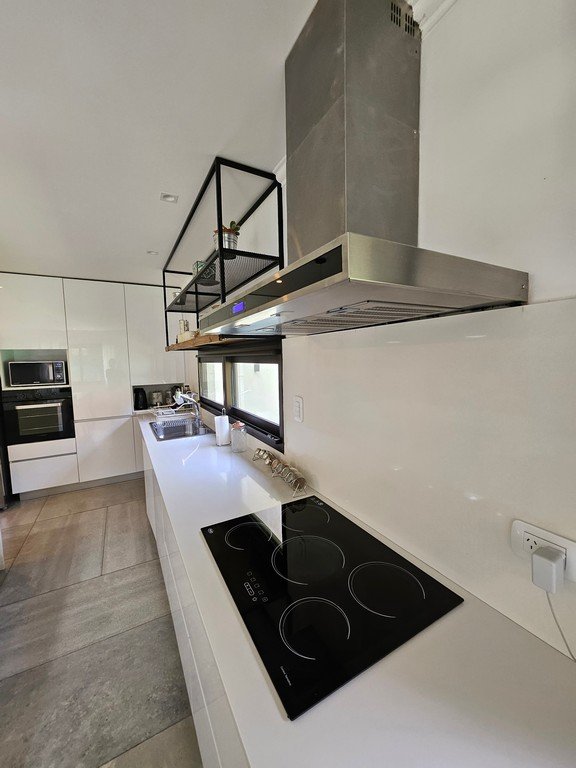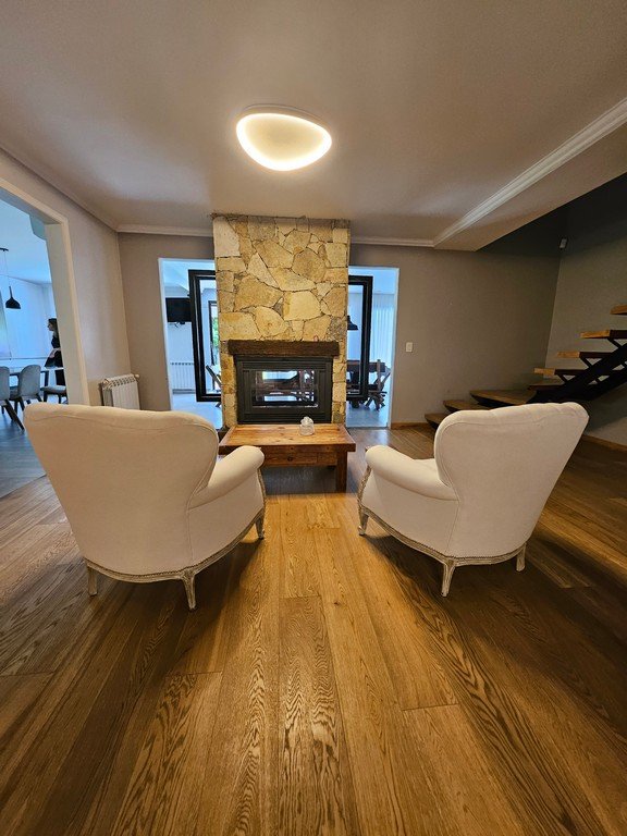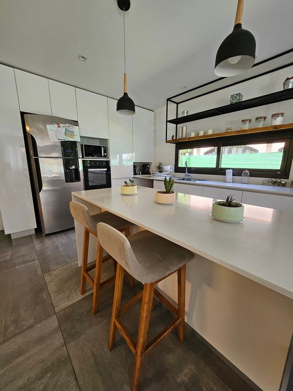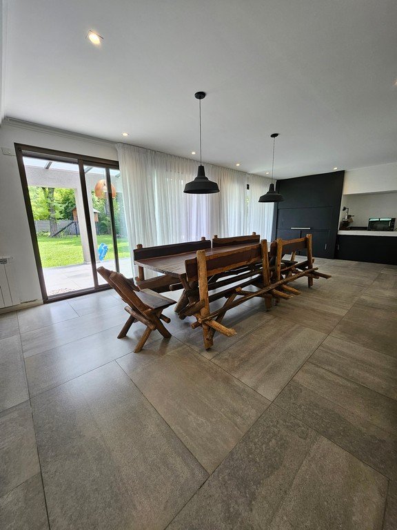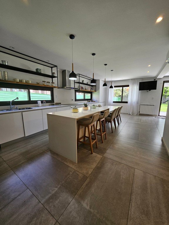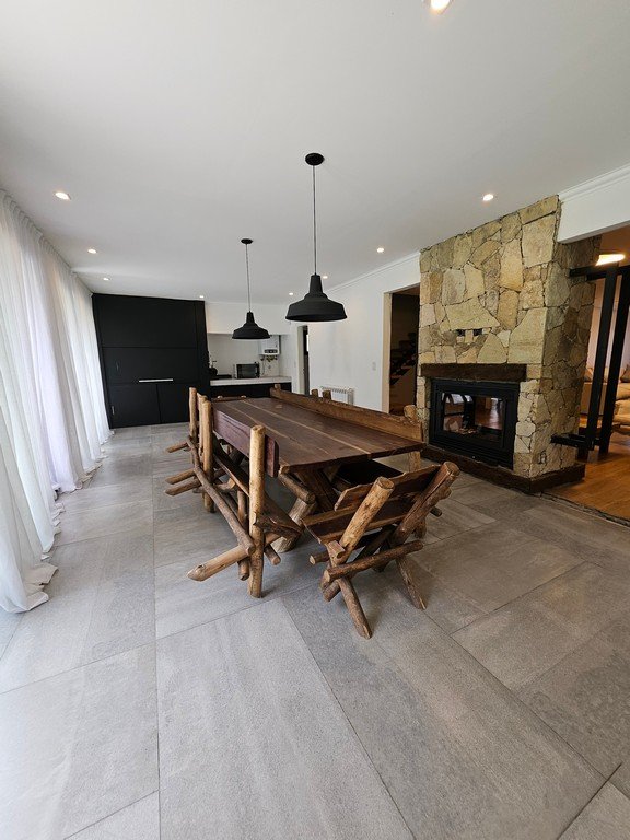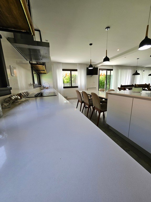 En planta baja contamos con amplio living con moderna salamandra con doble vista, gran cocina comedor con isla y mesa incorporada en silestone, muebles laqueados, horno y anafe eléctricos.