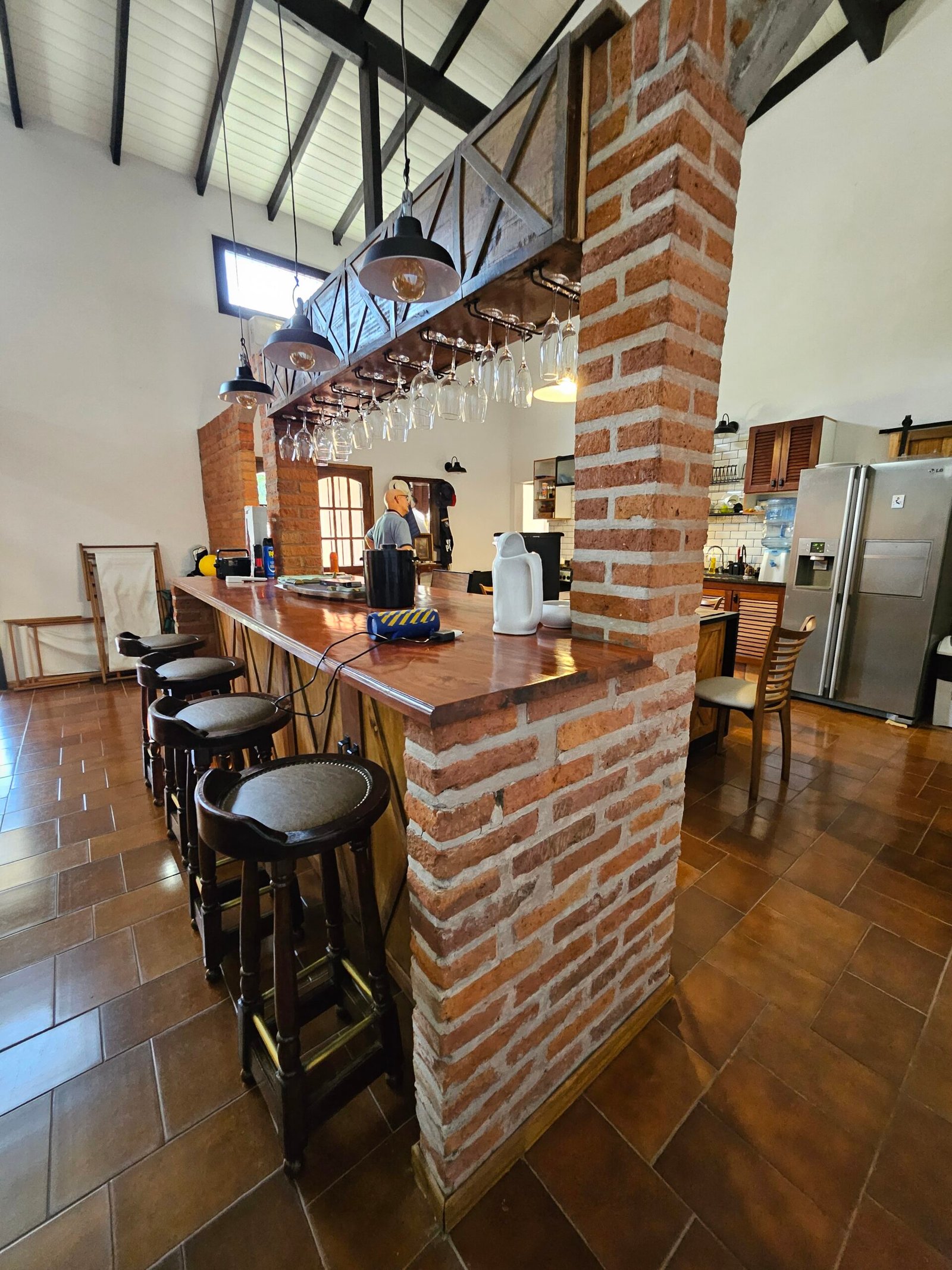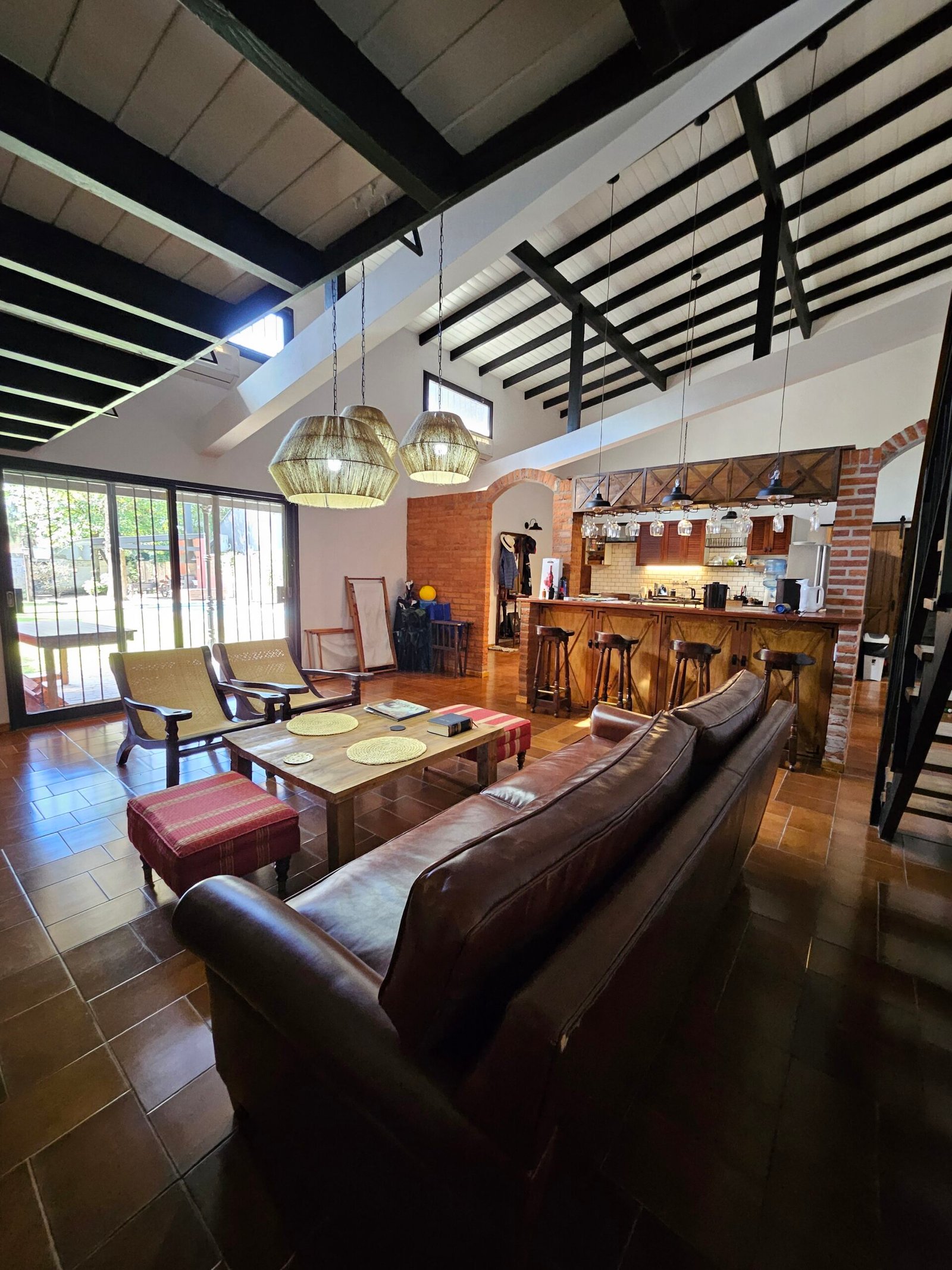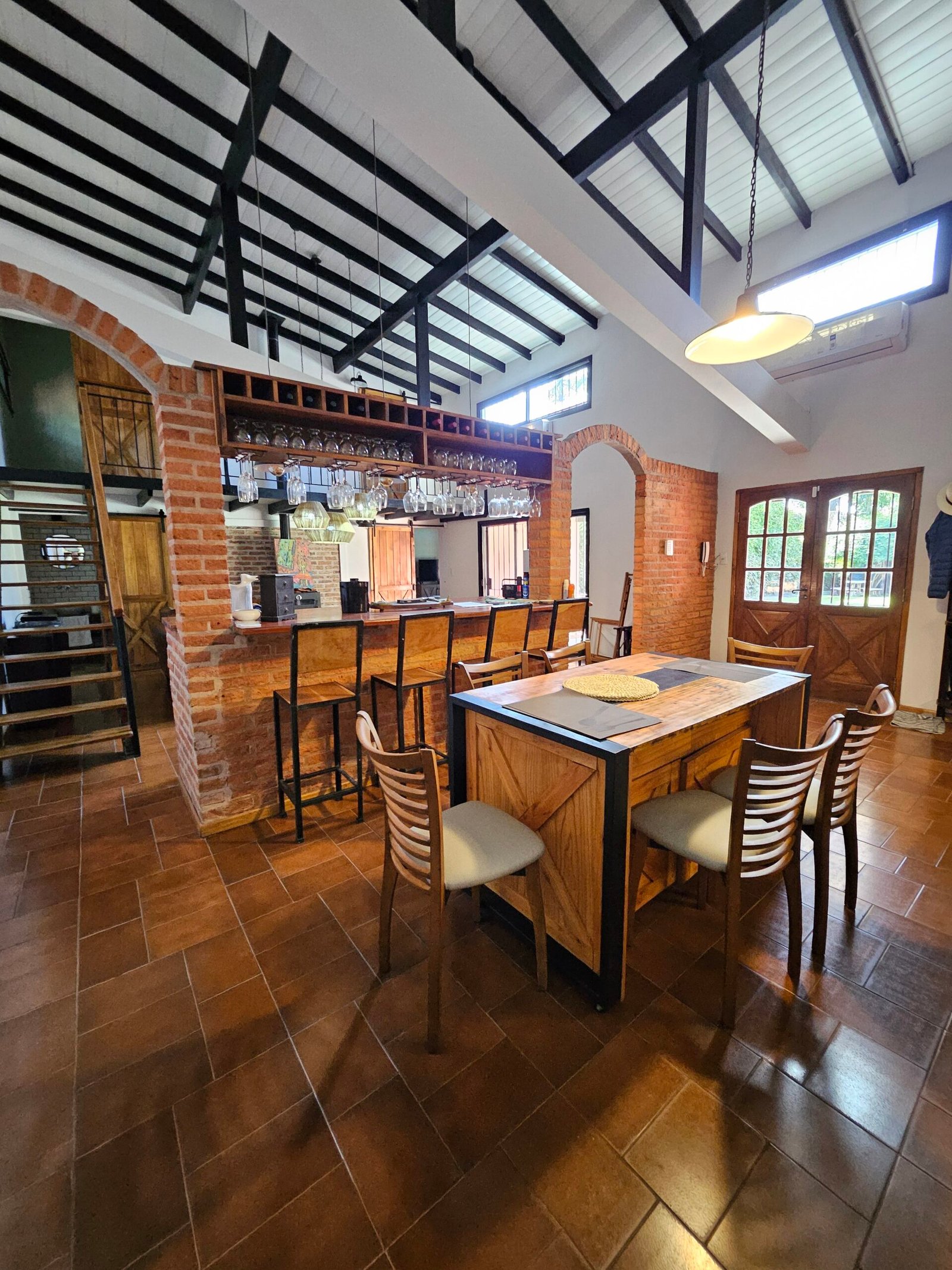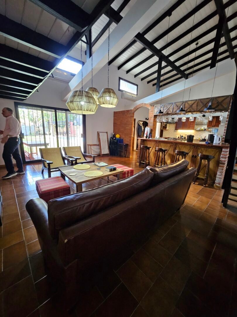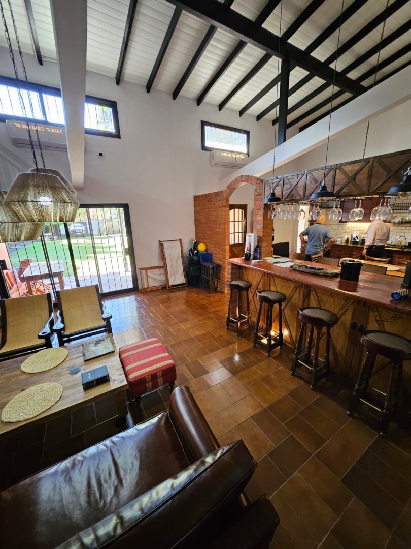 Galeria tipo porch de entrada con puerta doble de acceso. Gran ambiente muy luminoso integrado. cocina con barra y living, todo con vistas al jardin. Toilette de recepcion