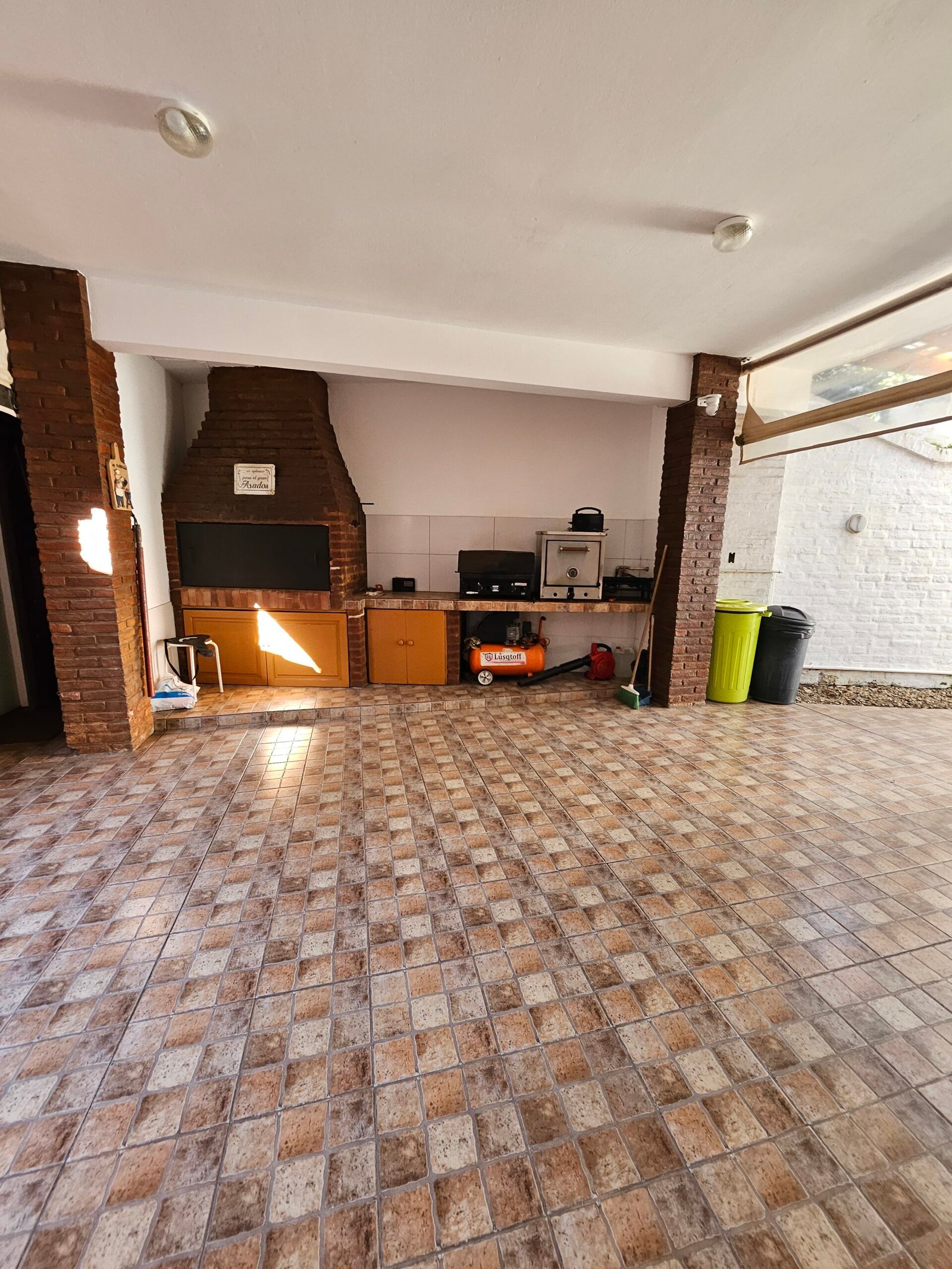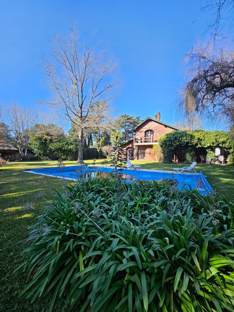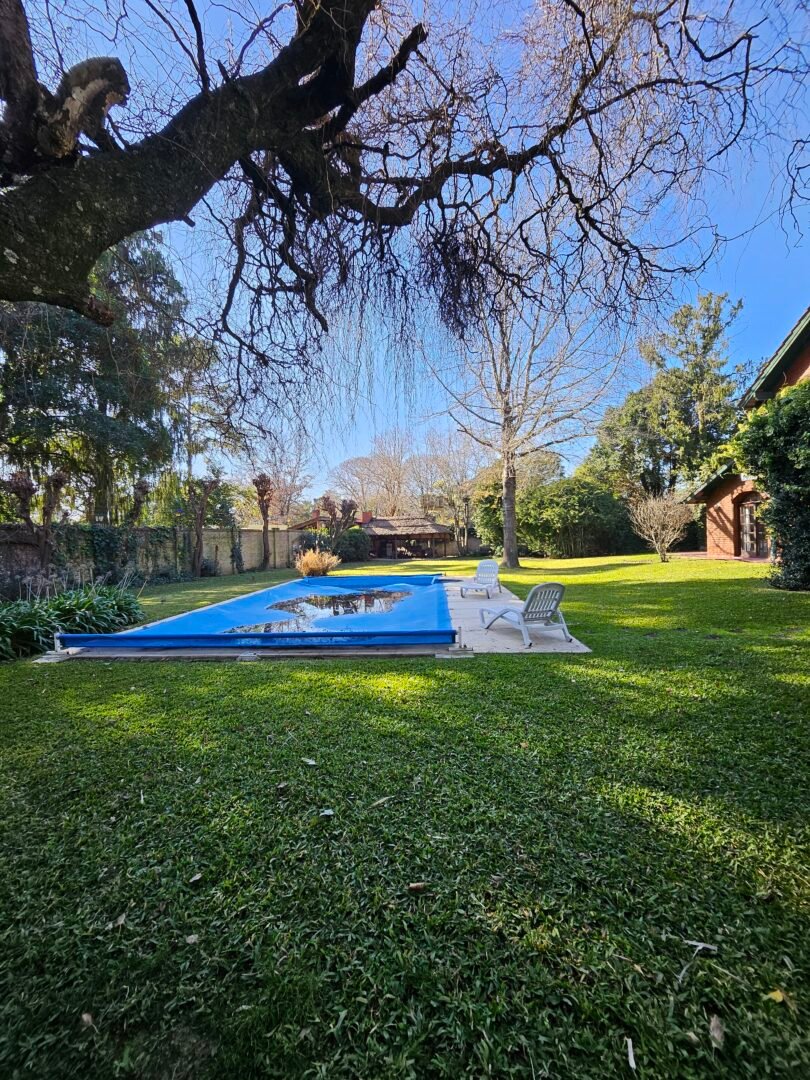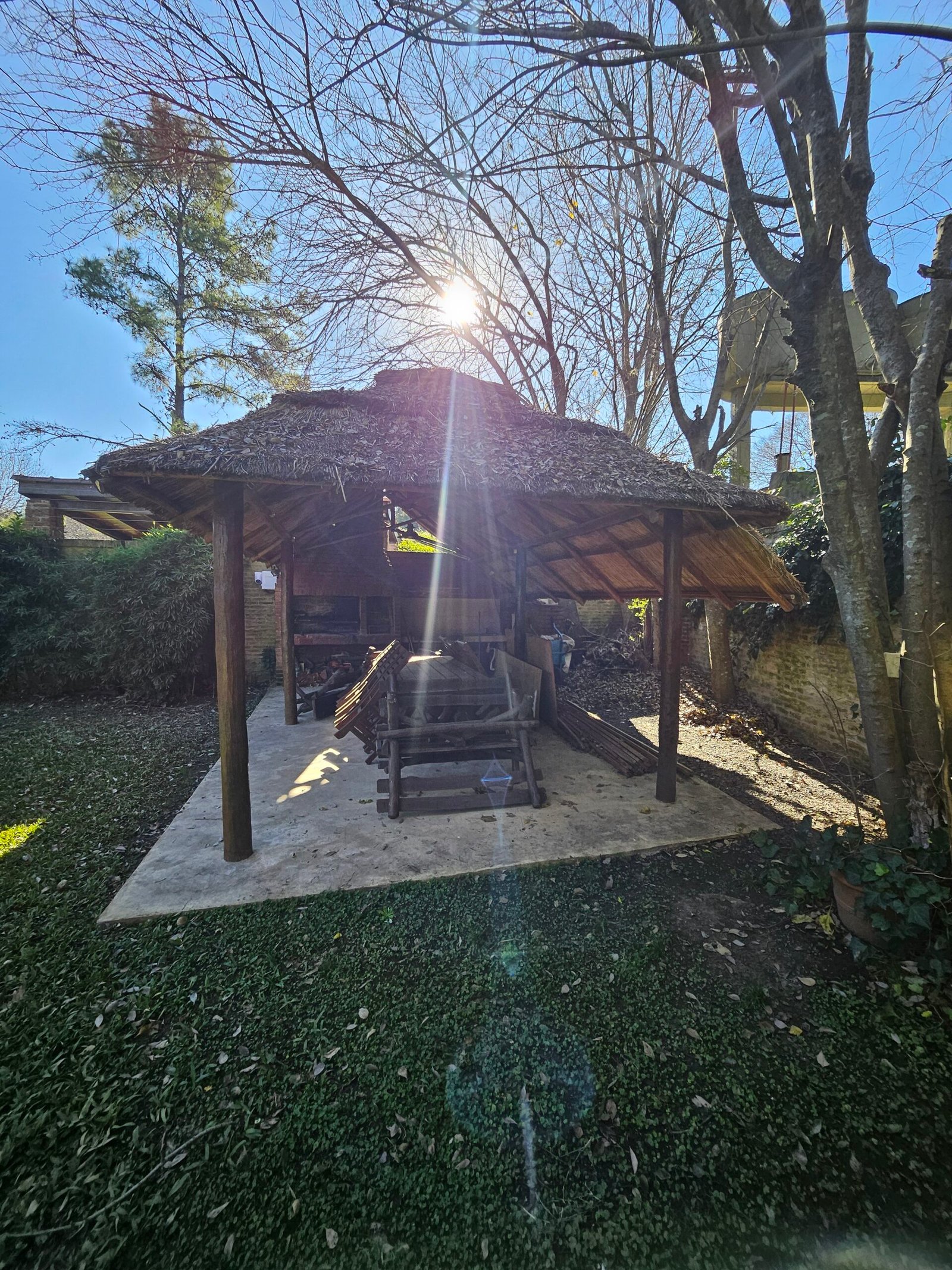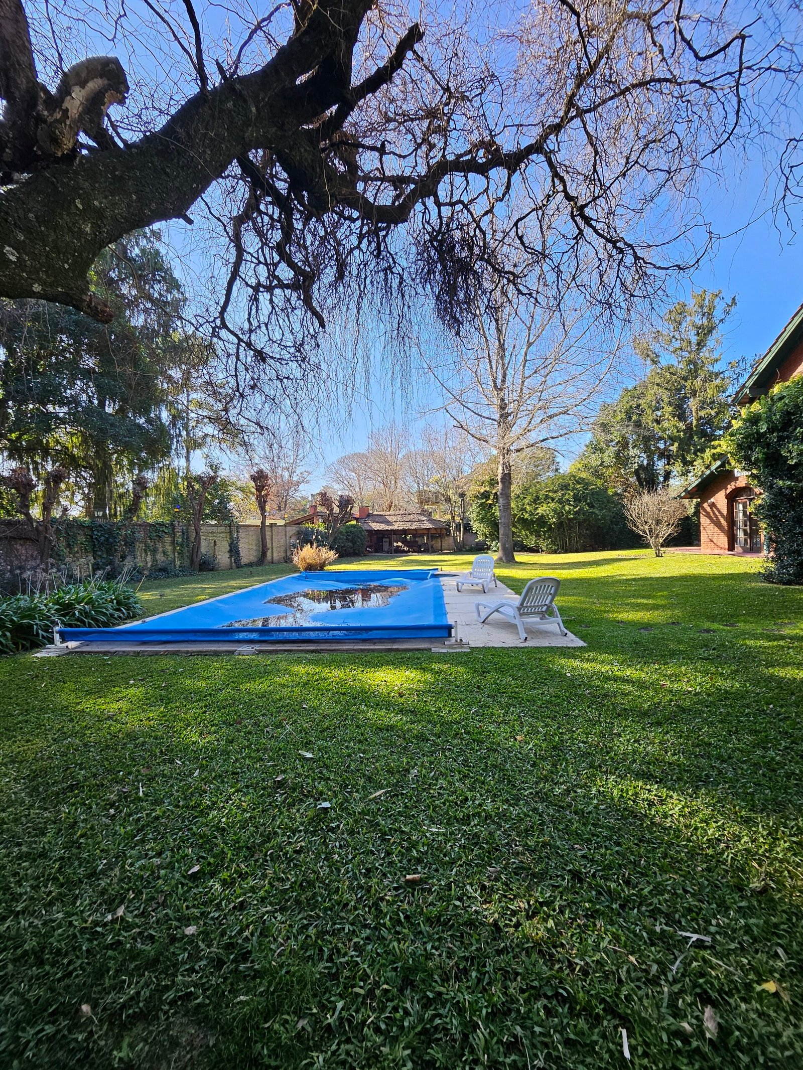 Quincho semi cubierto, garage semi cubierto para varios autos con parrilla, jardin arbolado con piletas de 12 x 5.