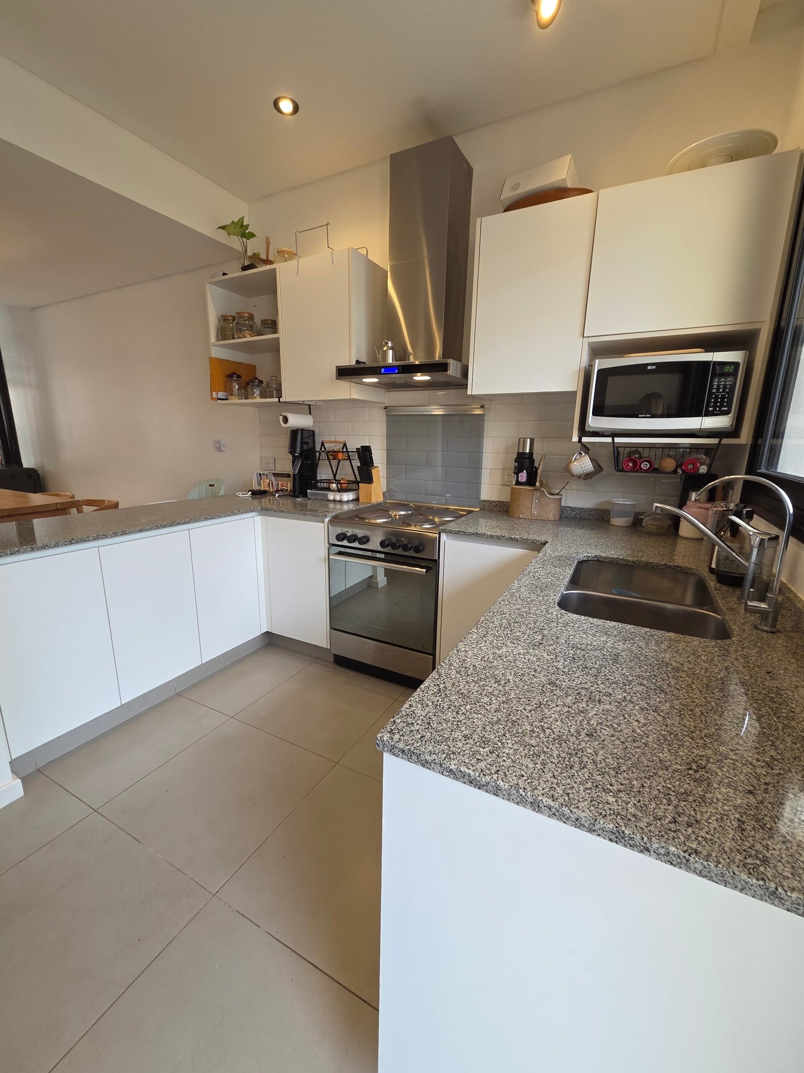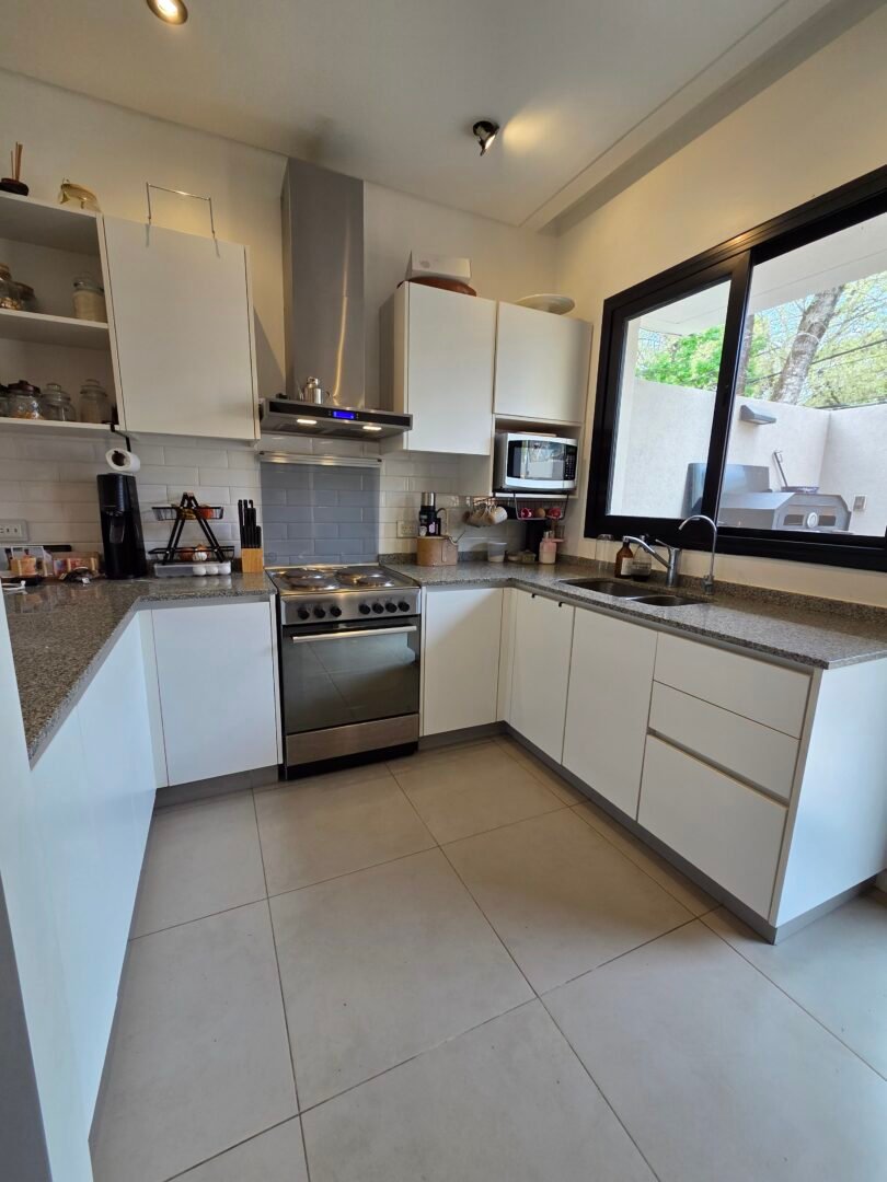 Al ingresar nos recibe un luminoso living comedor integrado, con grandes ventanales y salamandra Tromen, pensado para compartir momentos en familia o amigos, con conexión directa al jardín privado. La cocina se integra de manera practica y funcional, totalmente equipada, logrando un ambiente cálido y contemporáneo. Espacio oculto para conexión de lavarropas. Toilette de recepción