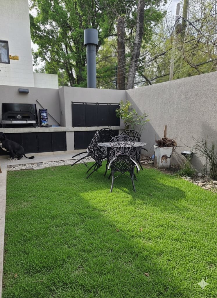 El jardín con parrilla invita a disfrutar de reuniones al aire libreen un entorno relajado. Cochera pasante cubierta con persiana de aluminio, guarda útiles y cochera externa para un segundo vehículo.