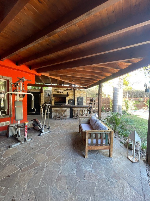 Jardín con pileta revestida en venecitas y gran galería con parrilla