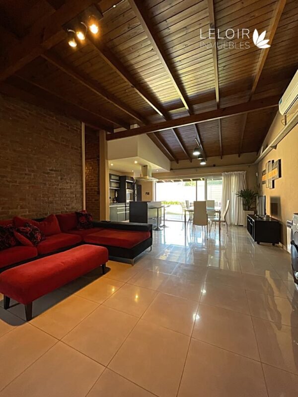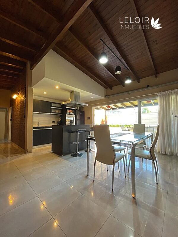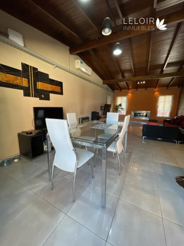 Amplio living comedor con hogar y cocina integrada con isla, totalmente equipada, mesada de Silestone. Gran ventanal con salida a la galería.